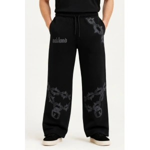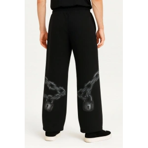 Erkek Üç İplik Pamuklu Baskılı Cepli Jogger Buggy Pantalon Oversize Kalıp - Siyah