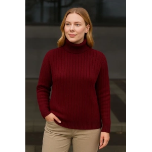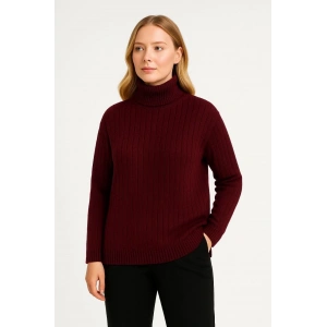 Kadın Balıkcı Yaka Bağazlı Triko Kazak Pamuklu Kalın Fitilli Dokuma - Bordo