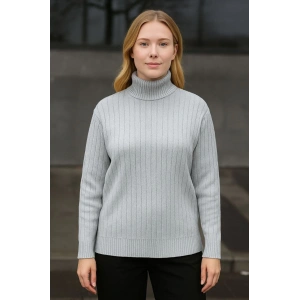 Kadın Balıkcı Yaka Bağazlı Triko Kazak Pamuklu Kalın Fitilli Dokuma - Gri