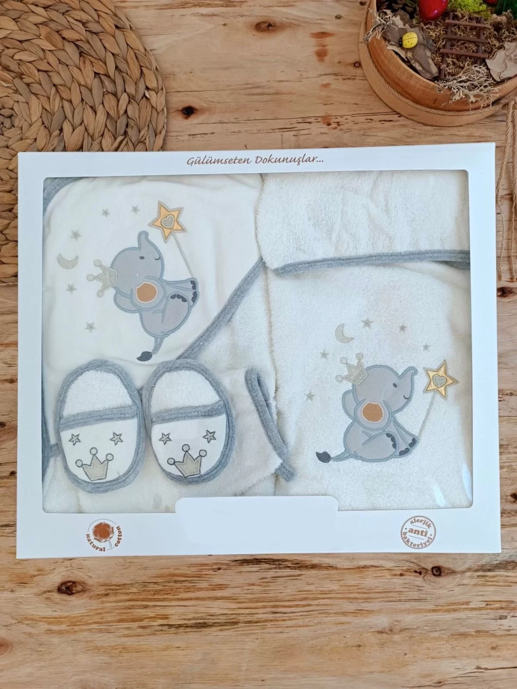 Naturel Anti Alerjik %100 Pamuk Kumaştan &Amp;Uuml;Retilmiştir. Yumuşak Dokusu Ile Cilde R Vermez. Bebek Tenine Temas Eden T&Amp;Uuml;M B&Amp;Ouml;L&Amp;Uuml;Mler Pamukludur. Y&Amp;Uuml;Ksek Su Emiciliği Sağlayan&Amp;Nbsp;&Amp;Ouml;Zel Harman Pamuklu Kumaştan &Amp;Uuml;Retilmiştir. 0-1 Yaş Arası Kullabilir. Kutu İ&Amp;Ccedil;Eri̇ği̇;1-Kapşonlu Bornoz2-Kapşonlu Banyo Havlusu3-Terlik4-Banyo Kesesi