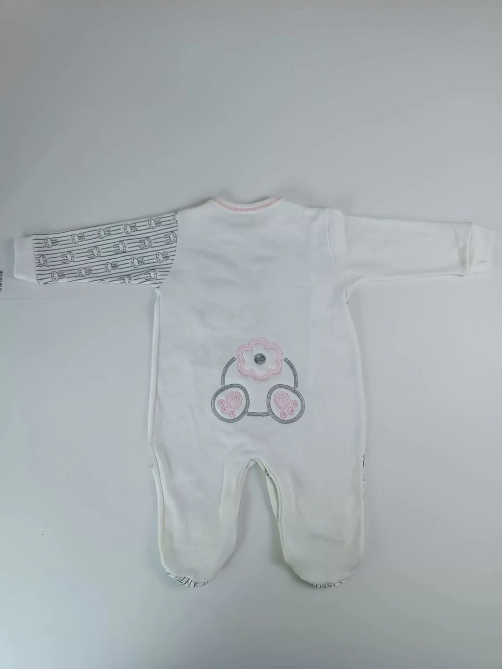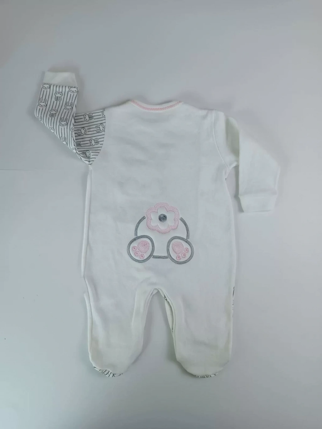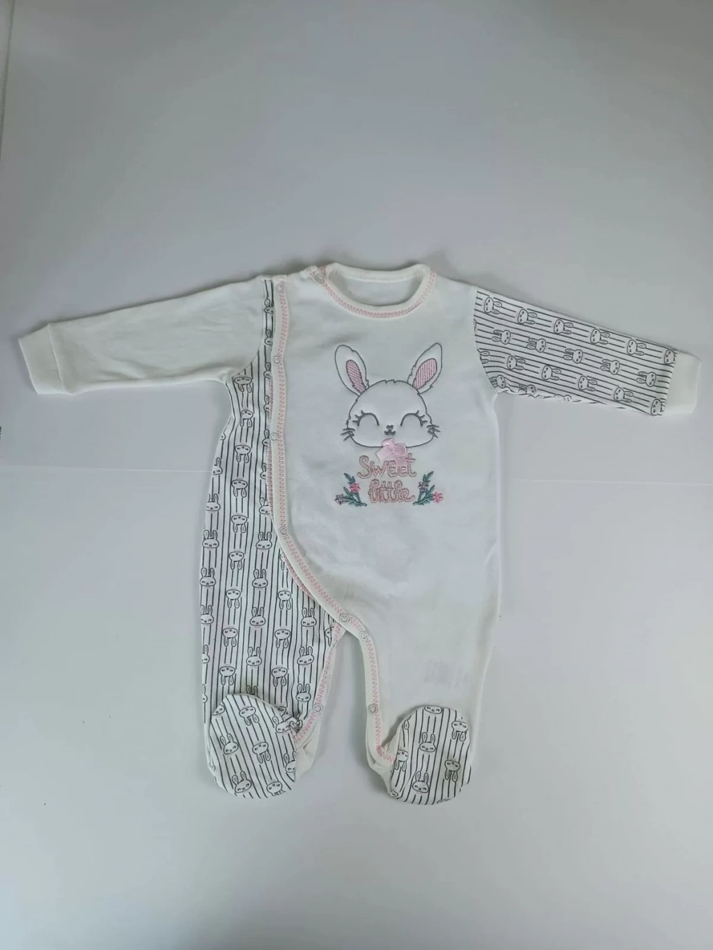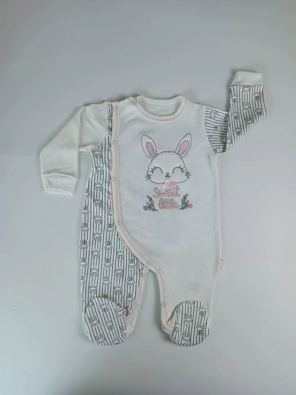 0-3 3-6 Ay Minik Tavşan Nakışlı Boydan Çıtçıt Kapamalı Kız Erkek Bebek Tulumu Ekru