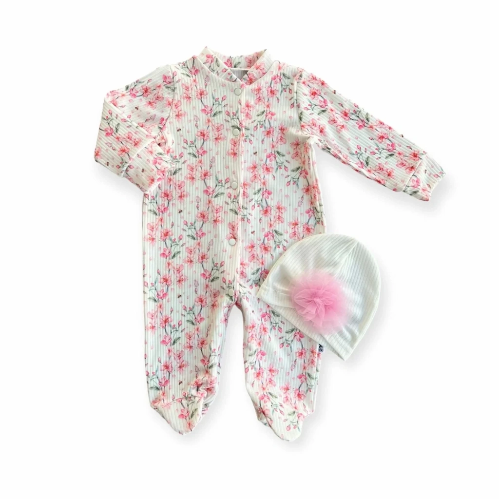 0-3-6-9 Ay Çiçek Baskılı Tam Boy Çıtçıtlı Patikli Güllü Boneli Kız Bebek Tulumu Ekru
