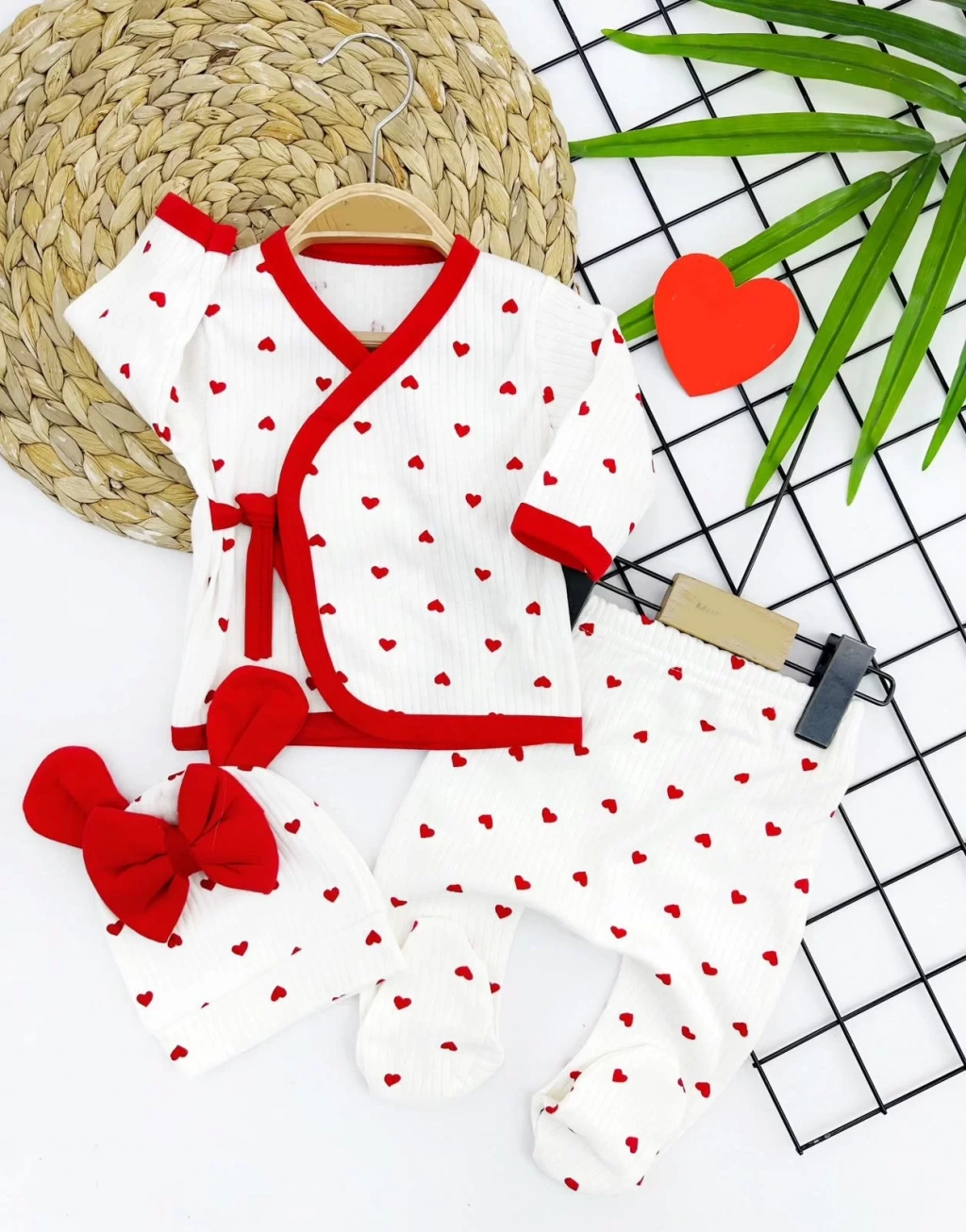 0-3 Ay Piti Kalp Desenli Şapkalı Patikli 3lü Kız Bebek Takımı Ekru