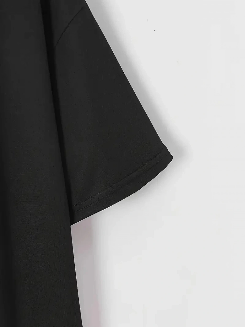 Rahat Bisiklet Yaka Tişört, Yaratıcı Karikatür Baskı - Yumuşak Polyester, Her Mevsim Giyilebilir- Siyah