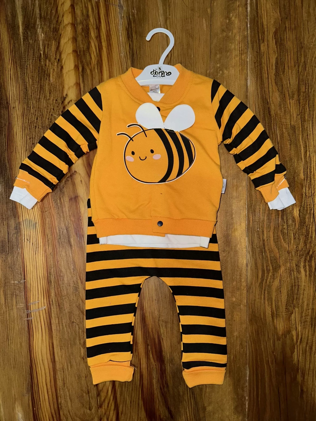 Sarı ve siyah renklerin uyumuyla dikkat çeken bu takım, kaliteli kumaşı sayesinde bebeğin cildine zarar vermeden şık bir görünüm sunar.