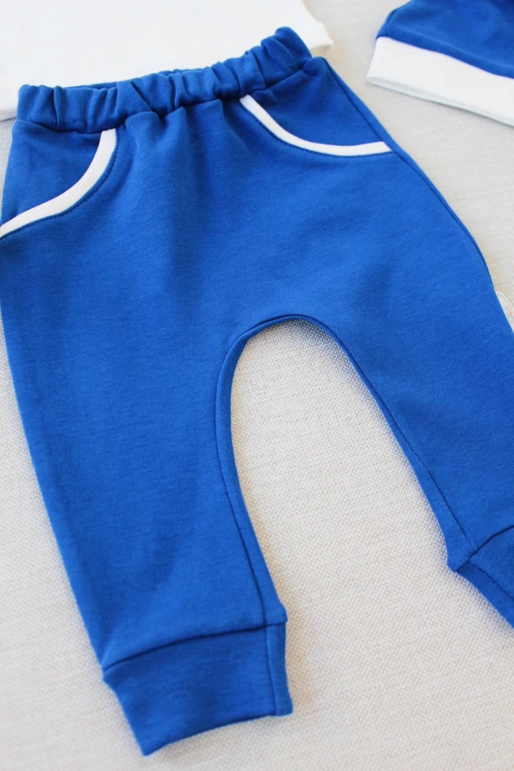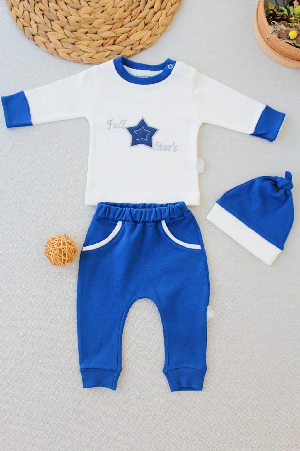 3-6 6-9 9-12 Ay Full Star Nakışlı Şapkalı Uzun Kollu Sweat 3lü Erkek Bebek Takımı İndigo