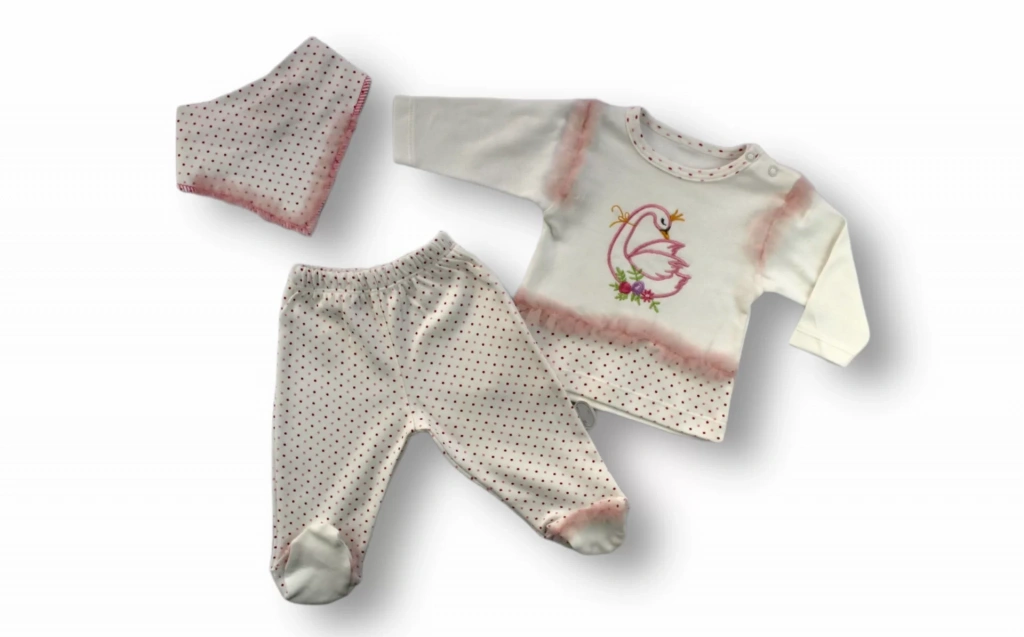 3-6 6-9 9-12 Ay Kraliçe Kuğu Nakışlı Bandajlı Uzun Kollu Sweatli 3lü Kız Bebek Takımı Ekru