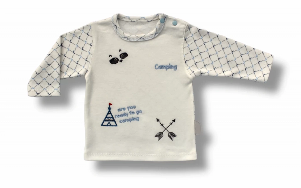 3-6 6-9 9-12 Ay My Camping Nakışlı Şapkalı Uzun Kollu Sweatli 3lü Erkek Bebek Takımı Ekru