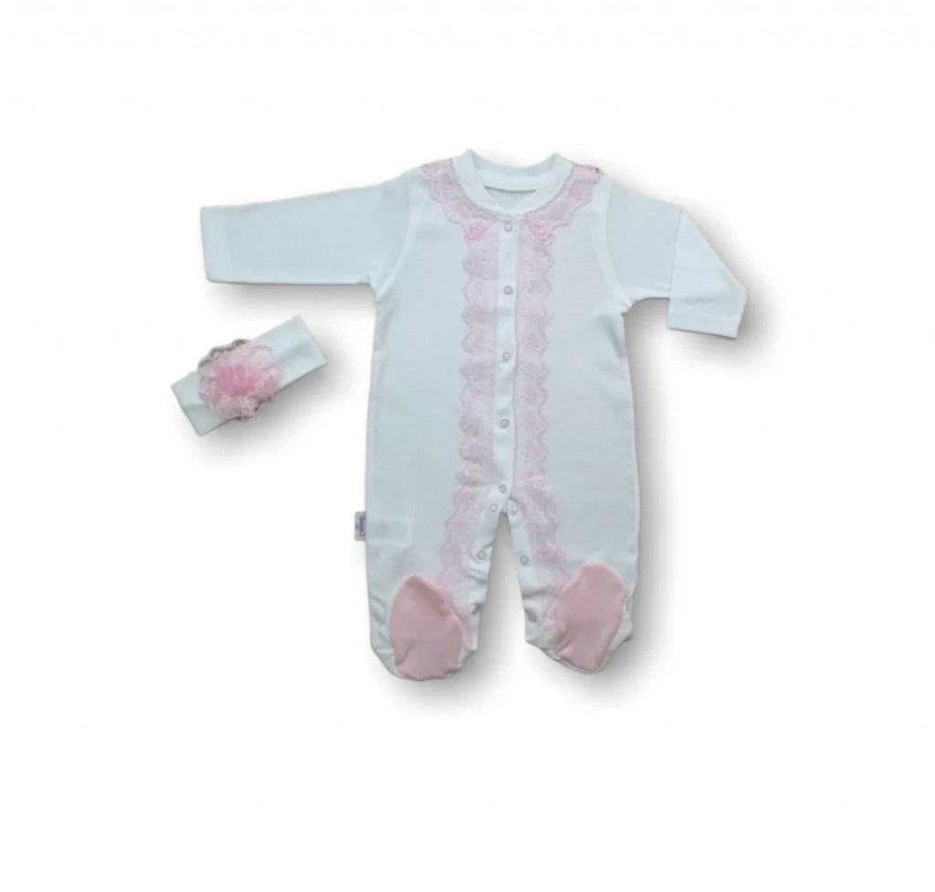 3-6 6-9 Ay Dantelli Boydan Çıtçıtlı Bandanalı Patikli Uzun Kollu Kız Bebek Tulumu Ekru