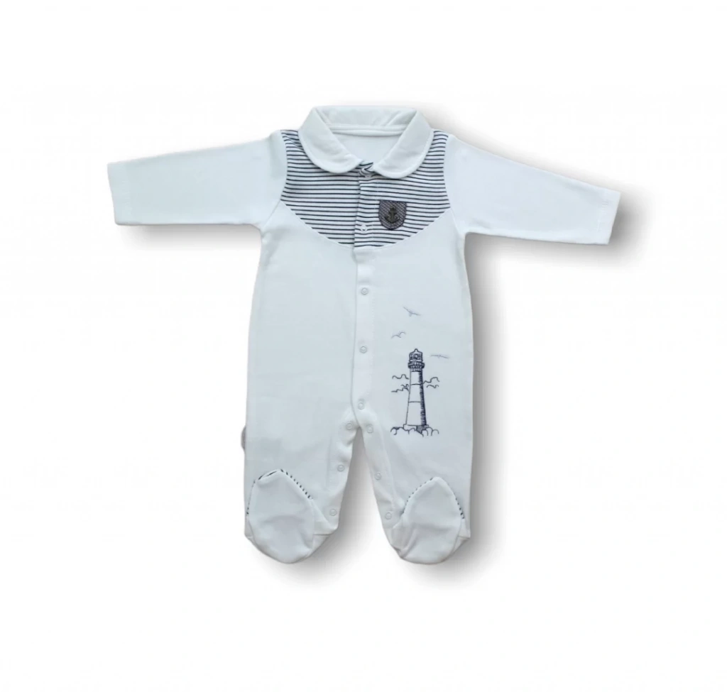 3-6 6-9 Ay Deniz Feneri Nakışlı Patikli Uzun Kollu Erkek Bebek Tulumu Ekru