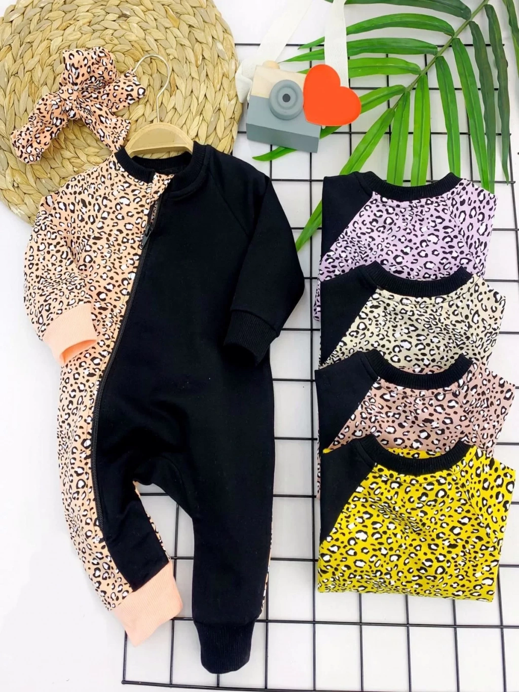 3-6-9-12 Ay Bandanalı Leopar Desenlı Fermuar Kapama Kız Bebek Tulumu Bej