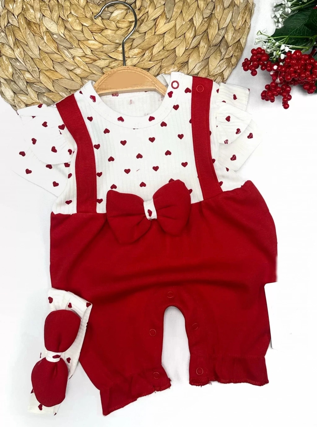 3-6-9-12 Ay Bandanalı Piti Kalp Baskılı Salopet Görünümlü 2li Kız Bebek Takımı