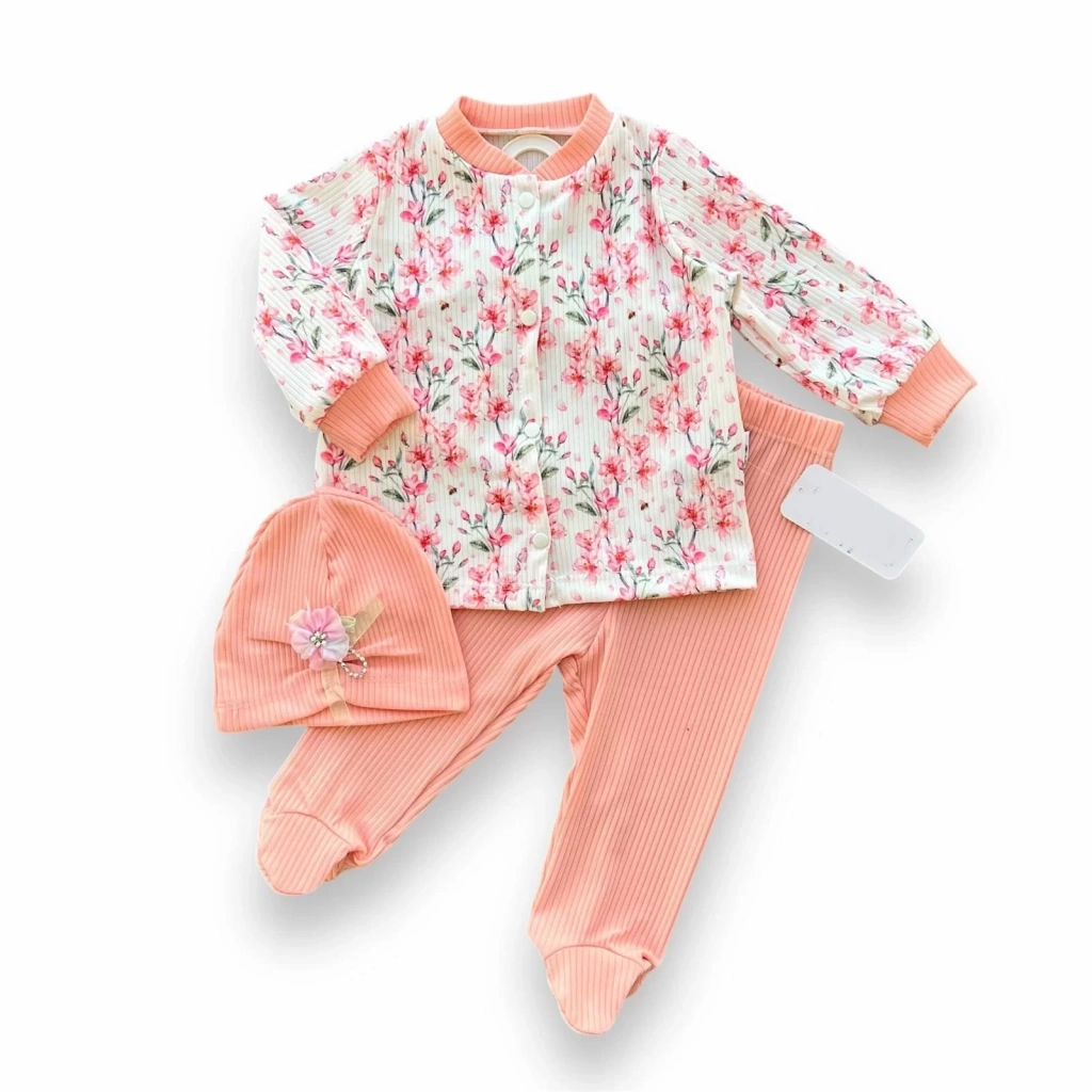 3-6-9-12 Ay Çiçek Baskılı Şapkalı Çıtçıt Kapamalı Patikli 3lü Kız Bebek Takımı Somon