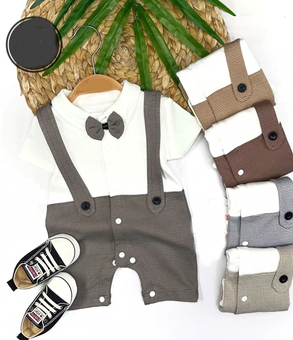 3-6-9-12 Ay Papyon Detaylı Çizgili Salopet Görünümlü Erkek Bebek Tulumu
