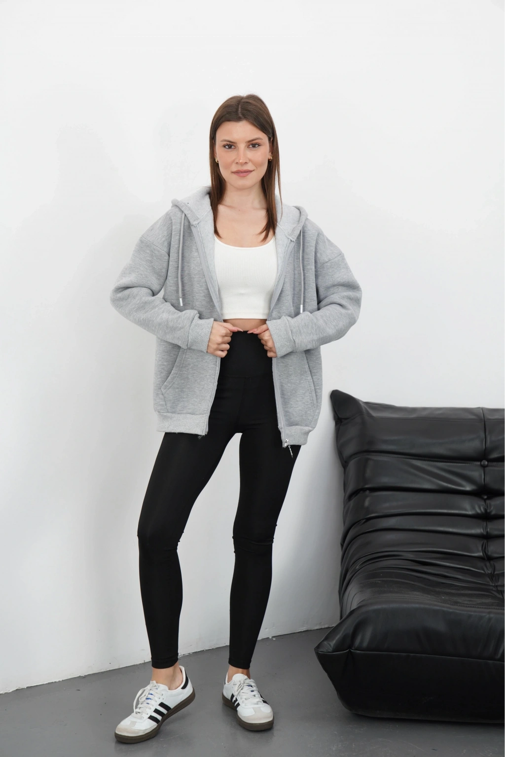 3 iplik şardonlu Kapşonlu fermuarlı kısa üst gri pat8590