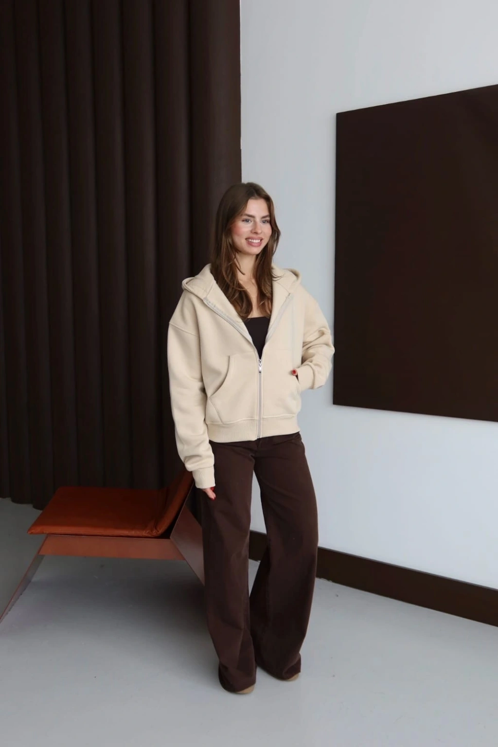 • 3 iplik şardonlu kapşonlu hoodie frm bej p510437