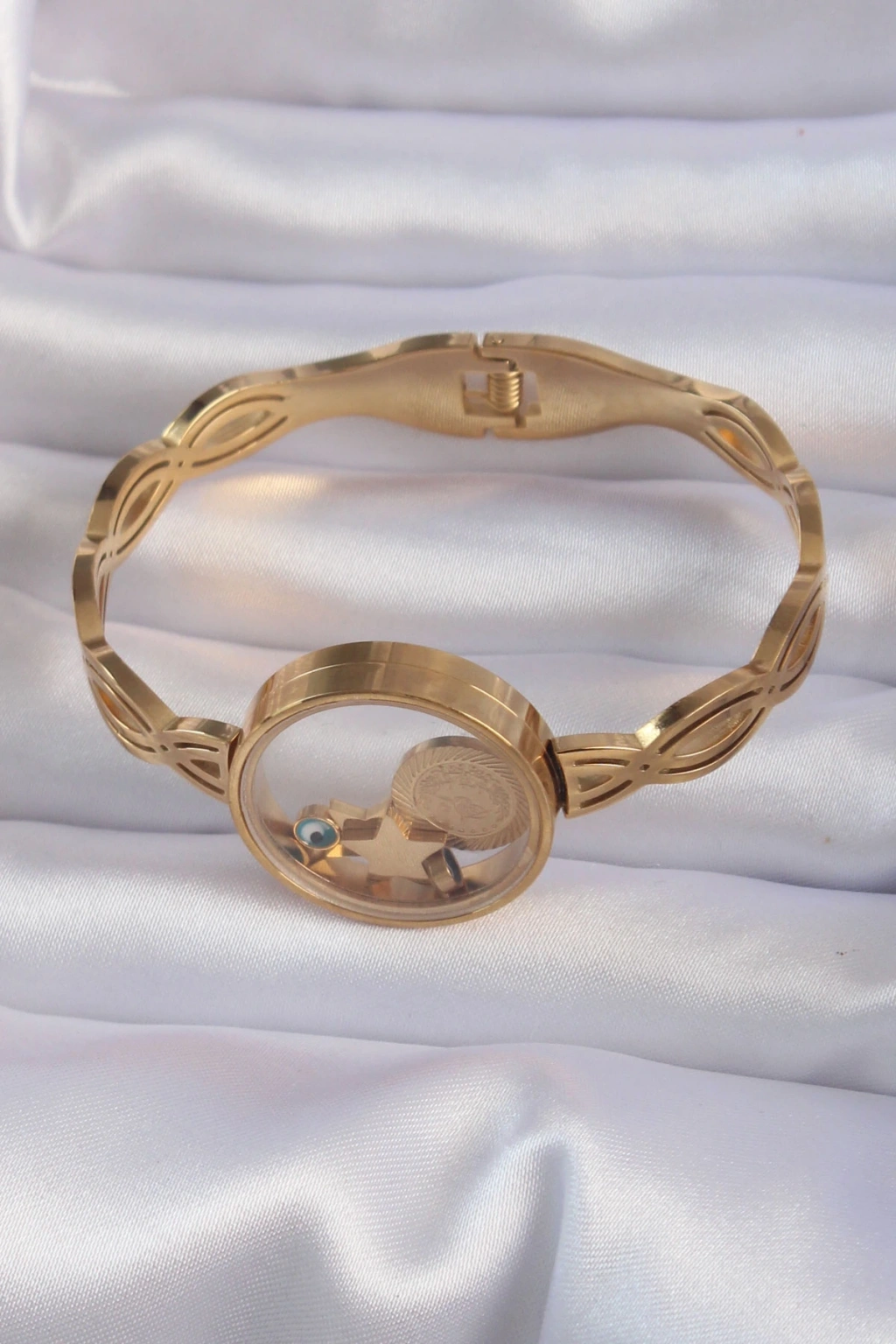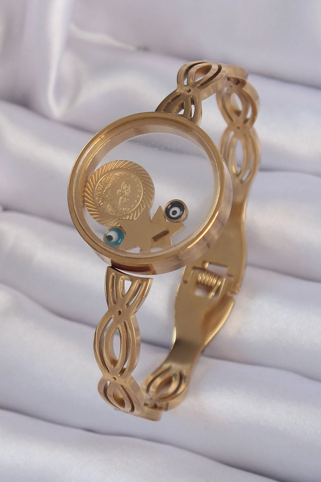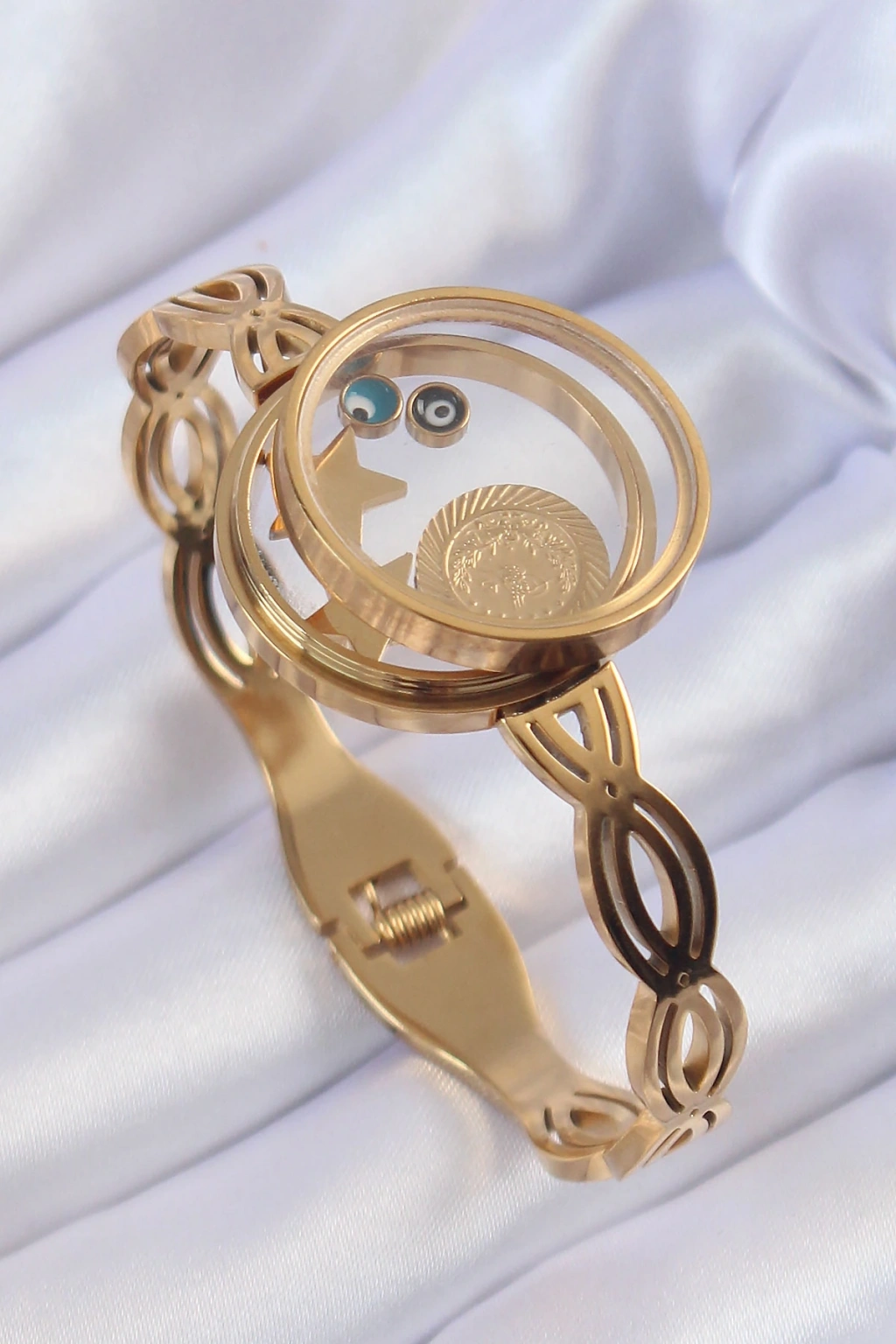 316l Çelik Altın Renk İçi Nazar Boncuk Ve Yıldız Figürlü Açılabilir Fanus Kelepçe
