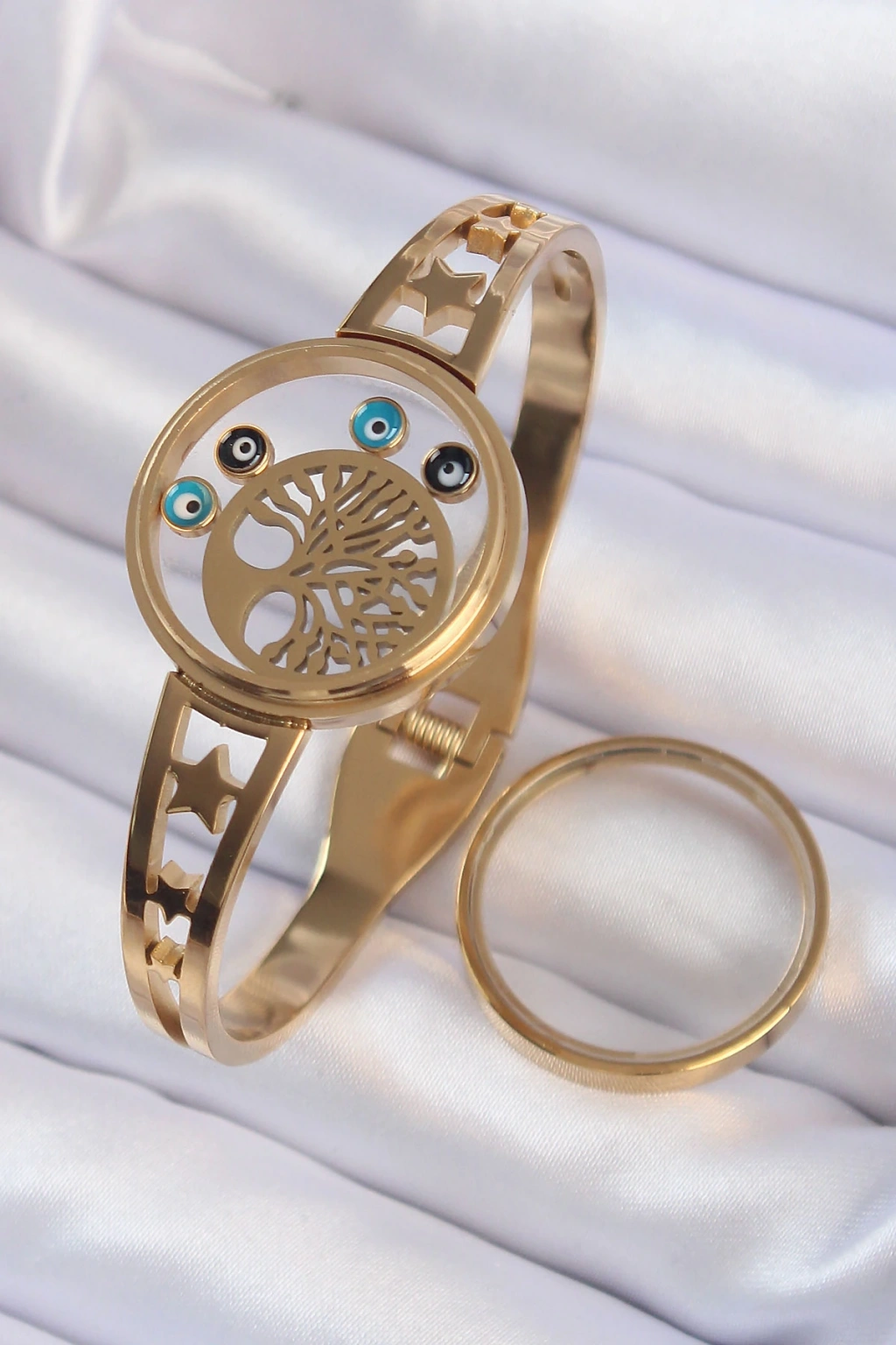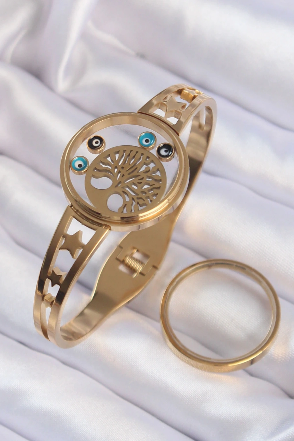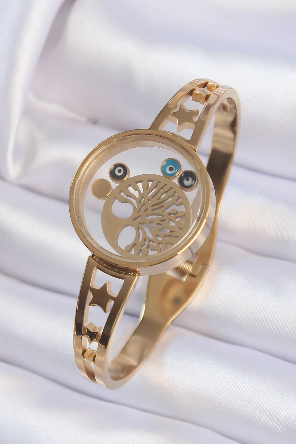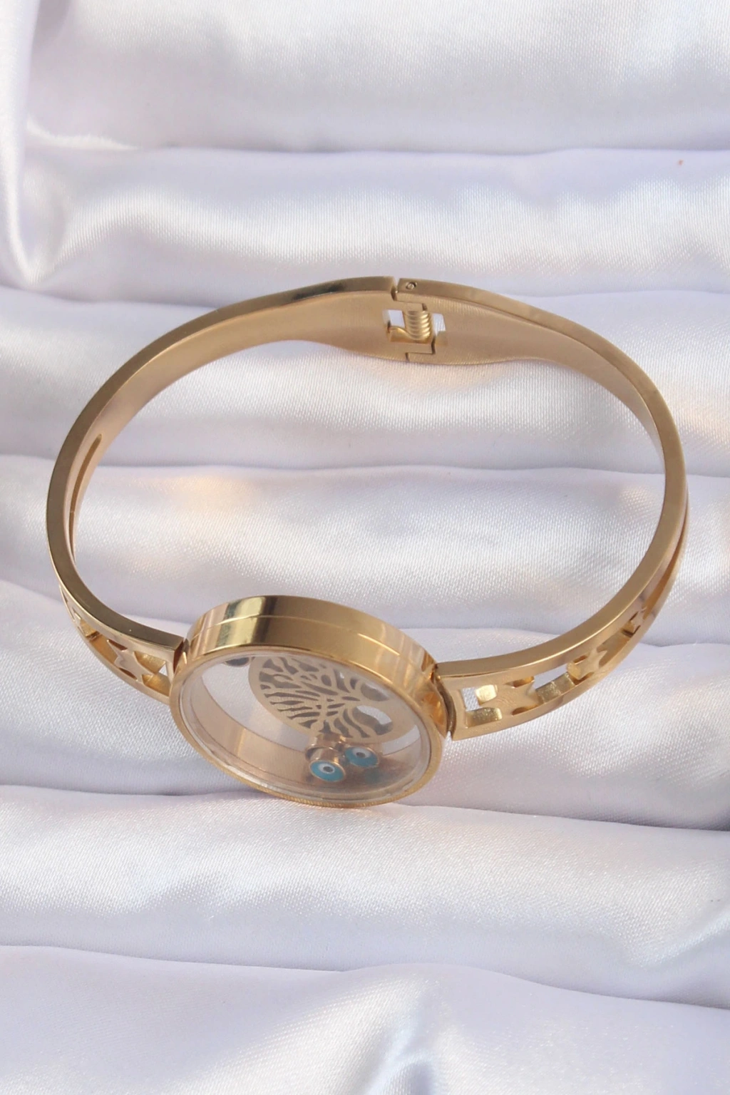 316l Çelik Altın Renk İçi Yaşam Ağacı Ve Nazar Boncuk Figürlü Açılabilir Fanus Kelepçe