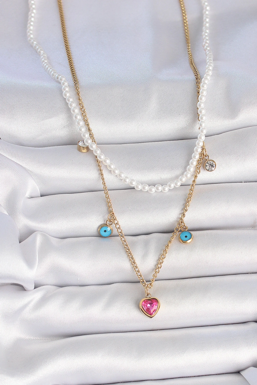 316l Çelik Gold Renk 2'li İnci Zincir Model Pembe Taşlı Kalp Figür Nazar Boncuk Detay Kadın Kolye