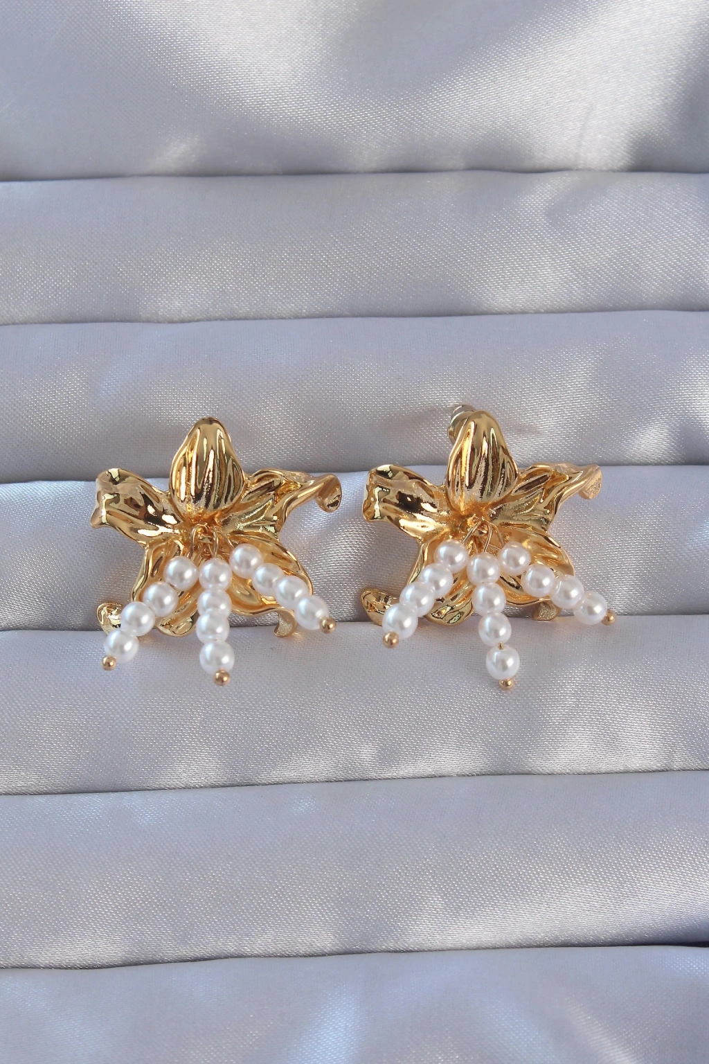 316l Çelik Gold Renk İnci Aksesuarlı Çiçek Model Küpe