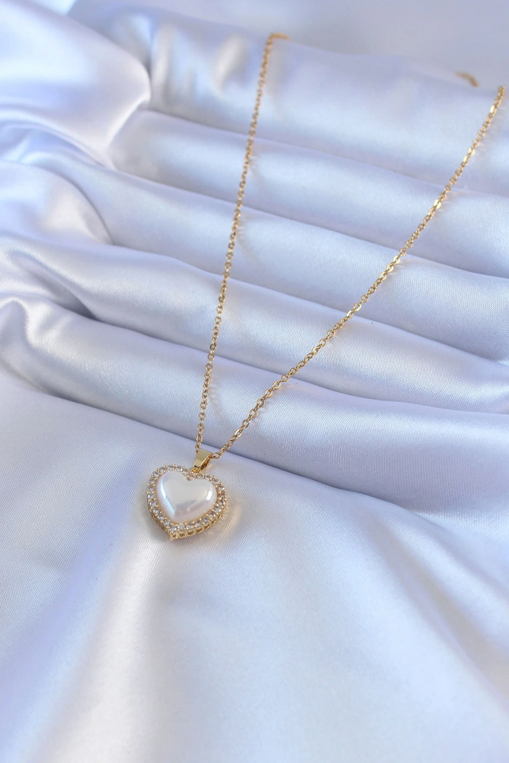 316l Çelik Gold Renk İncili Kalp Model Zirkon Taşlı Kadın Kolye