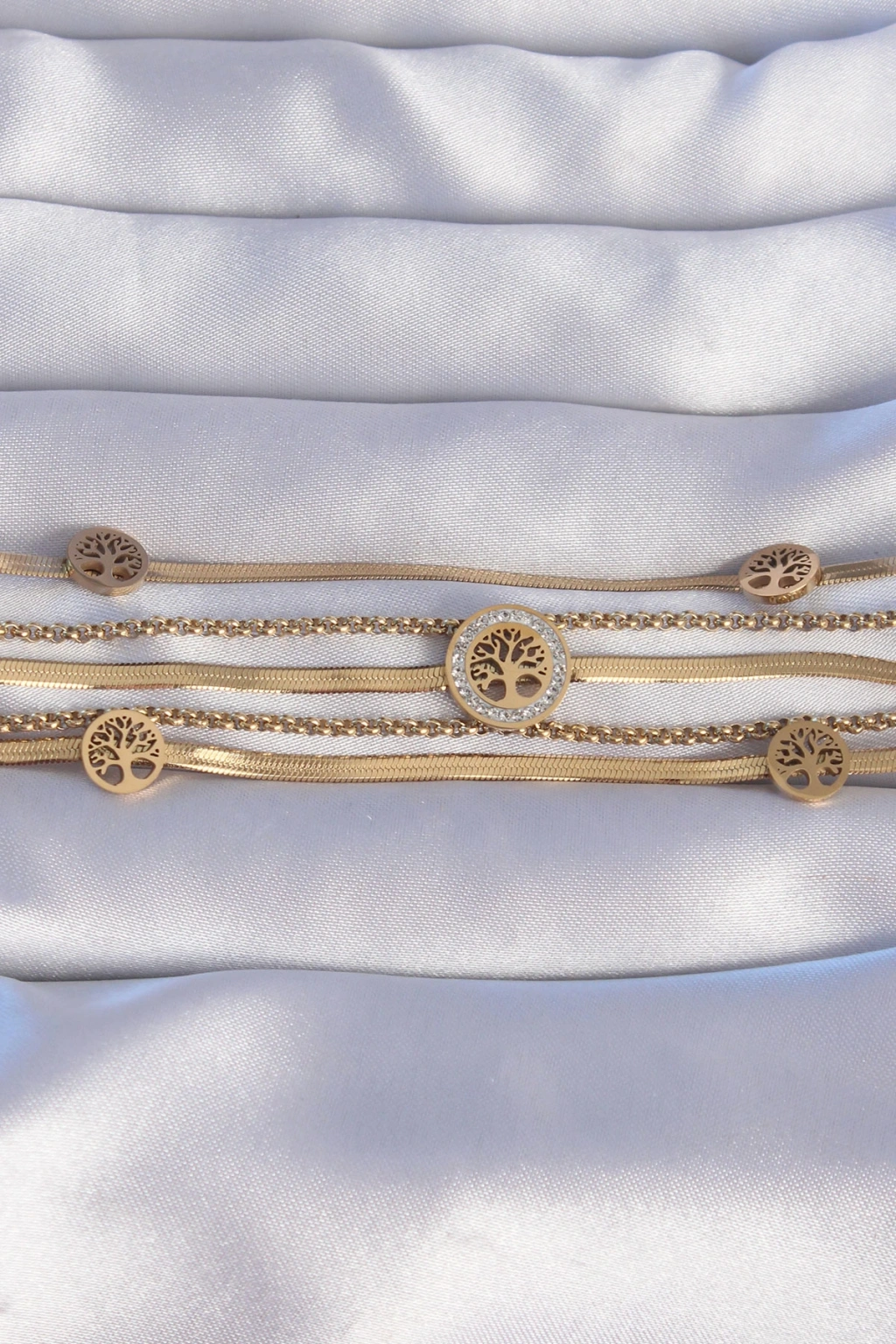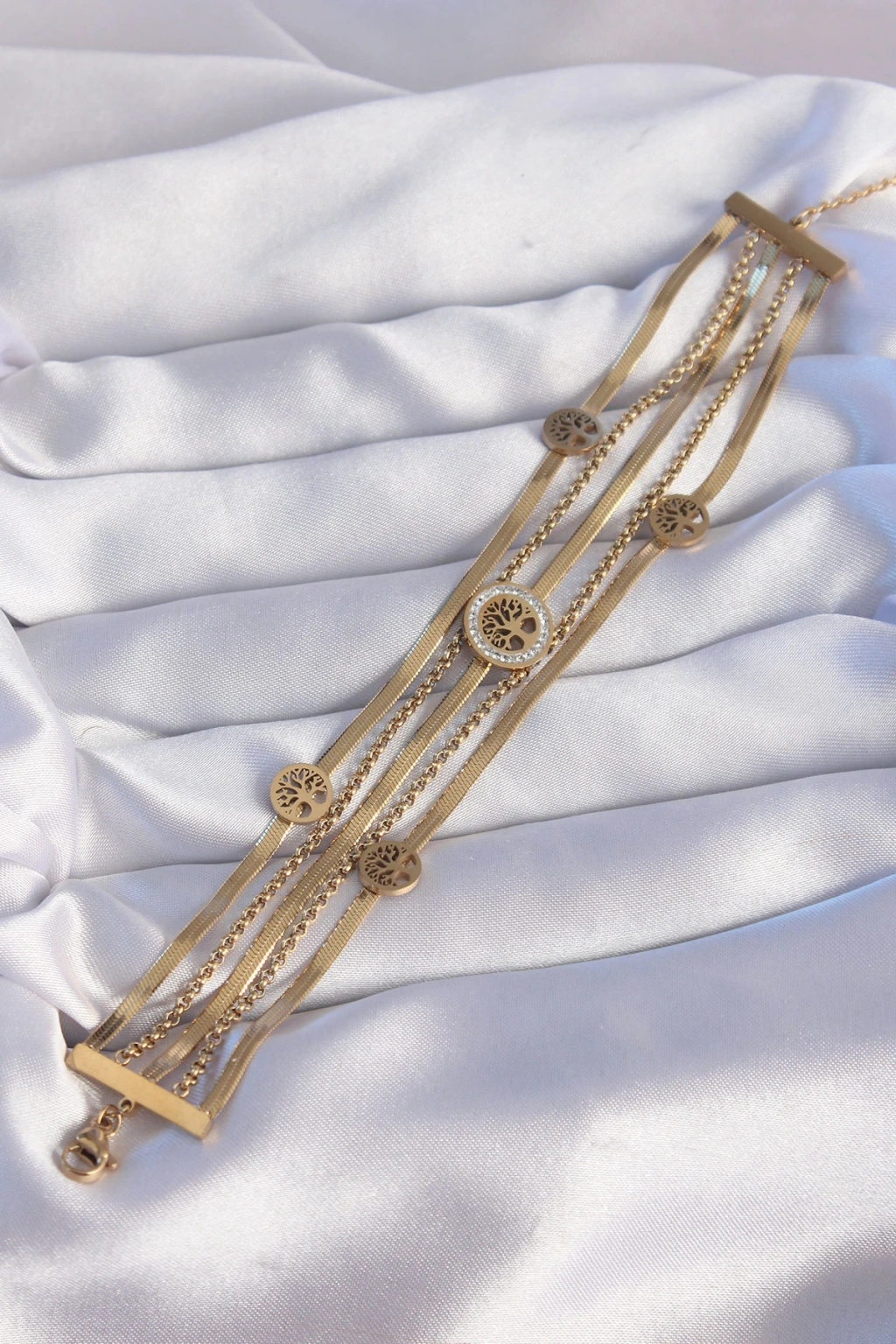 316l Çelik Gold Renk İtalyan Zincir Detaylı Zirkon Taşlı Yaşam Ağacı Tasarımlı Çoklu Bileklik