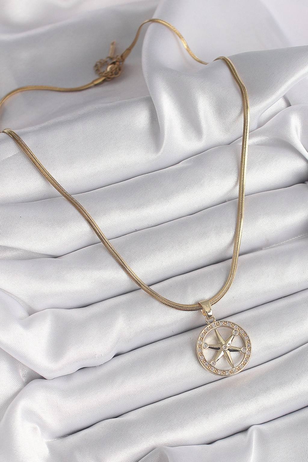 316l Çelik Gold Renk İtalyan Zincir Zirkon Taşlı Kutup Yıldız Model Kadın Kolye