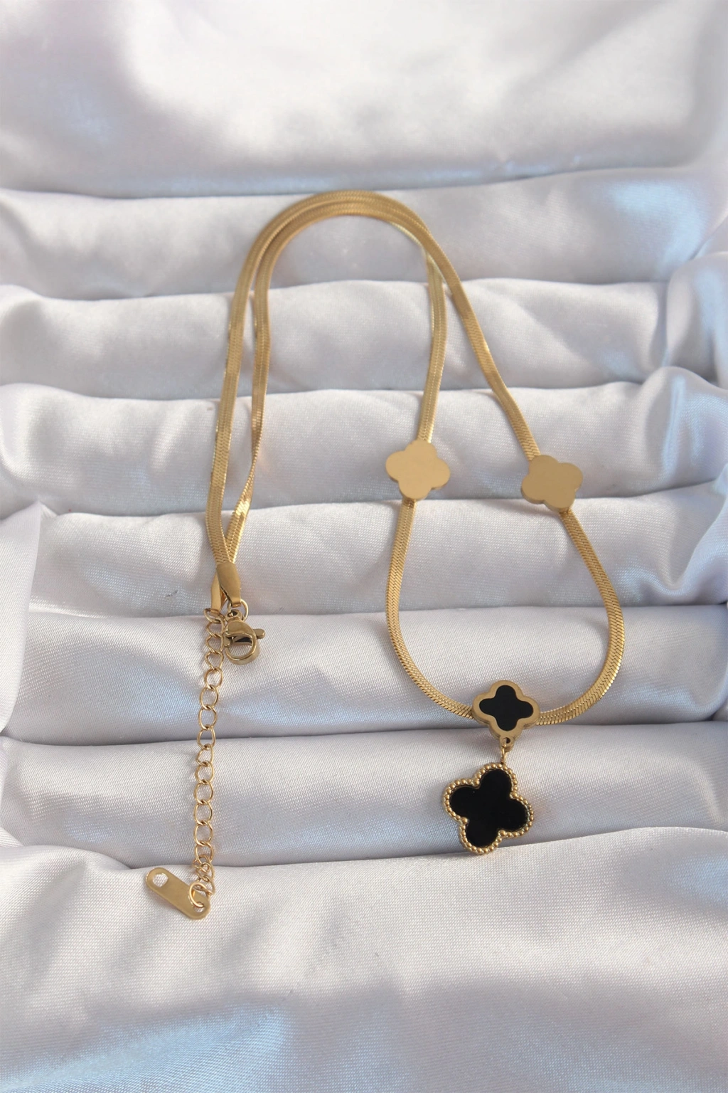 316L Çelik Gold Renk İtalyan Zincirli Mineli Yonca Kolye