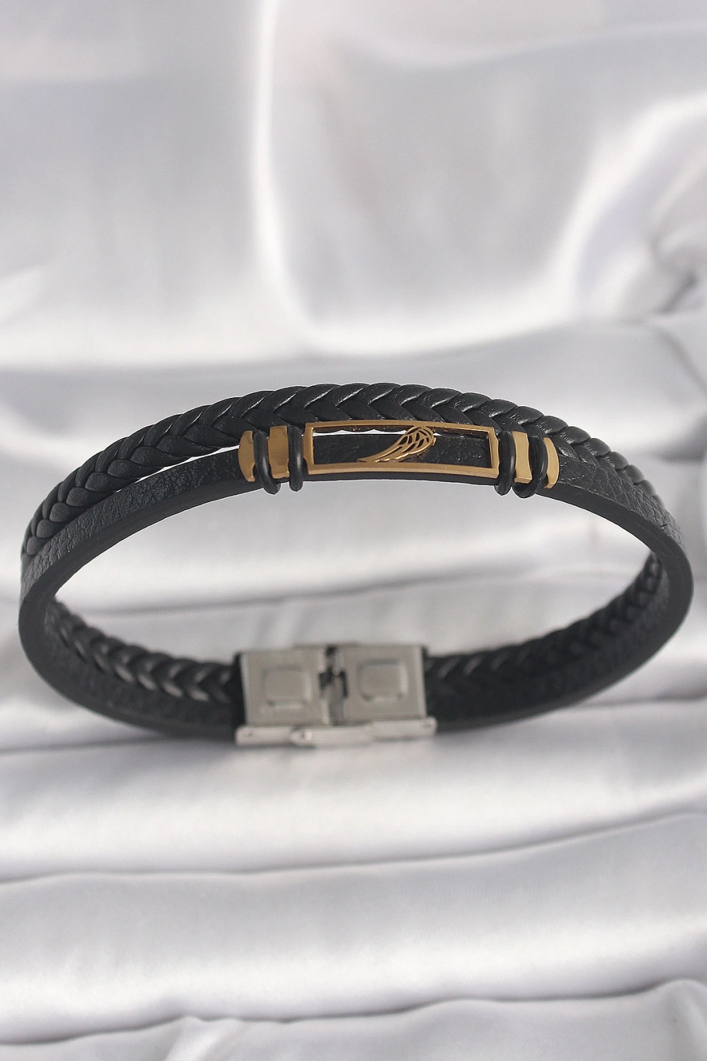 316l Çelik Gold Renk Kanat Aksesuarlı Siyah Burgu Model Deri Kordon Erkek Bileklik