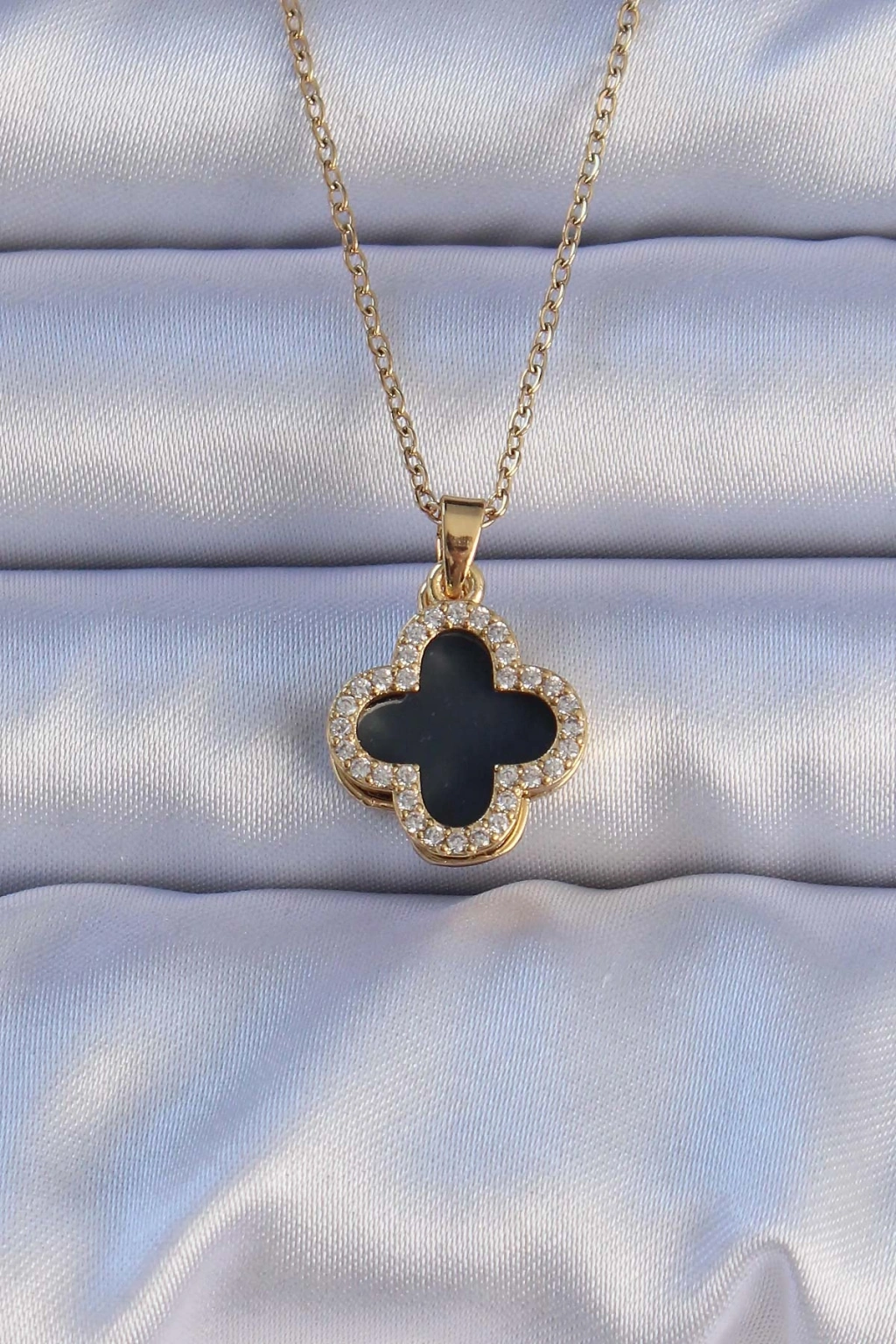 316L Çelik Gold Renk Siyah Mineli Zirkon Taşlı Yonca Figürlü Kolye