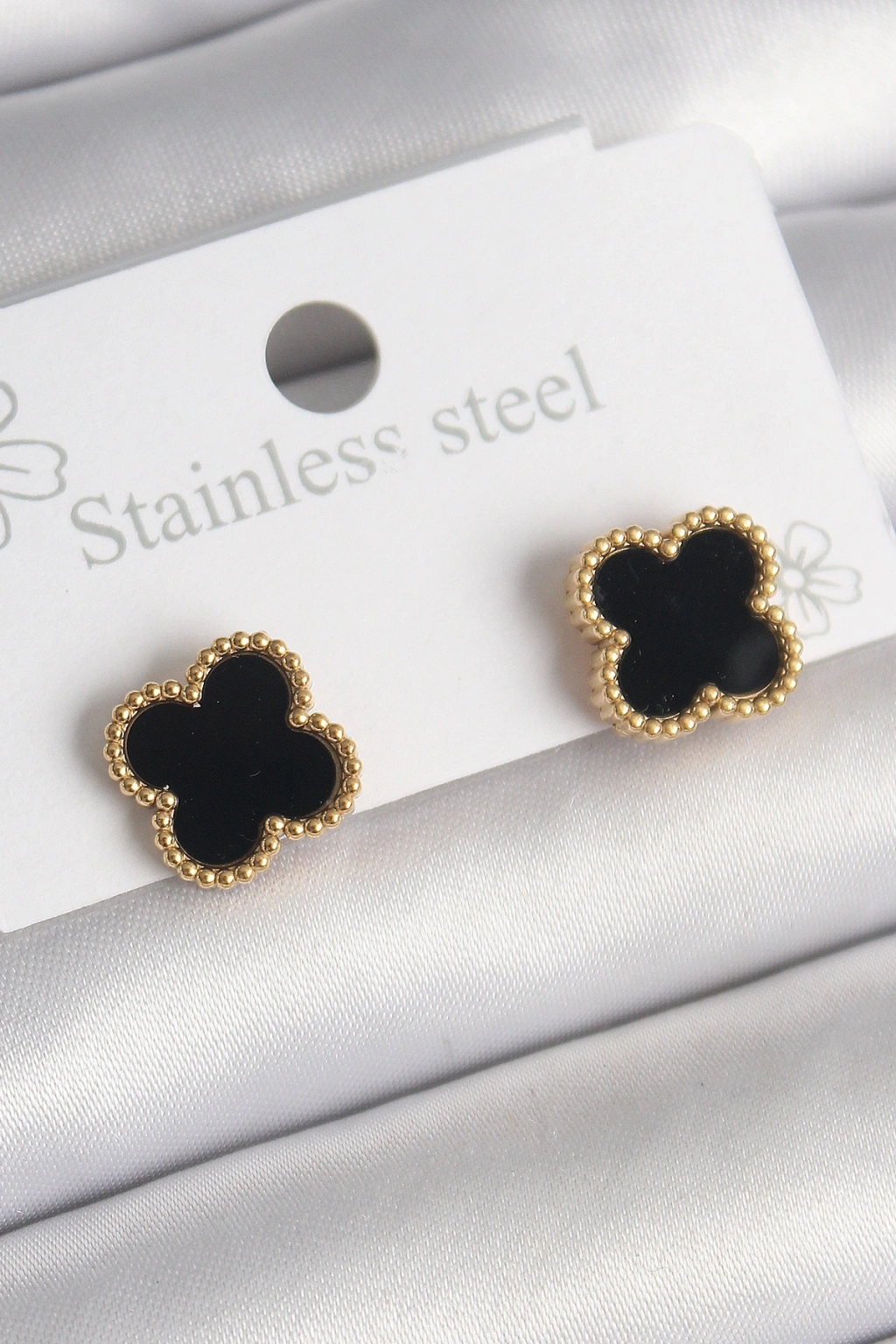 316l Çelik Gold Renk Siyah Yonca Model Kadın Küpe