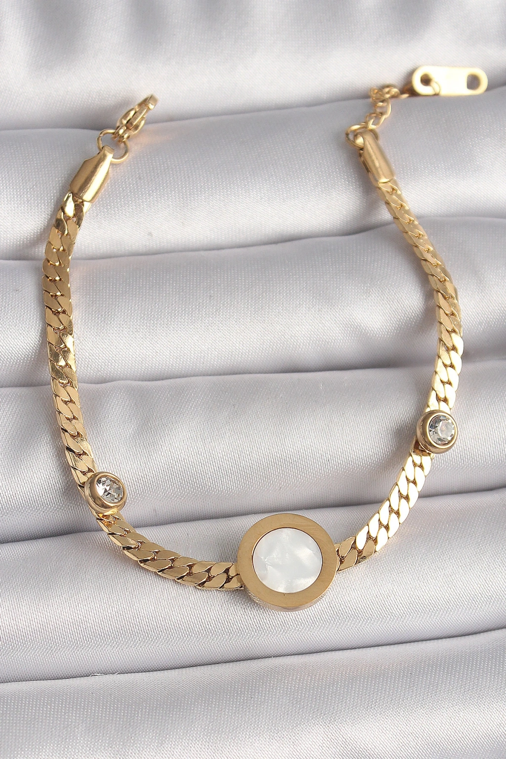 316l Çelik Gold Renk Yassı Zincir Model Zirkon Taş Detaylı Beyaz Mineli Madalyon Model Kadın Bileklik