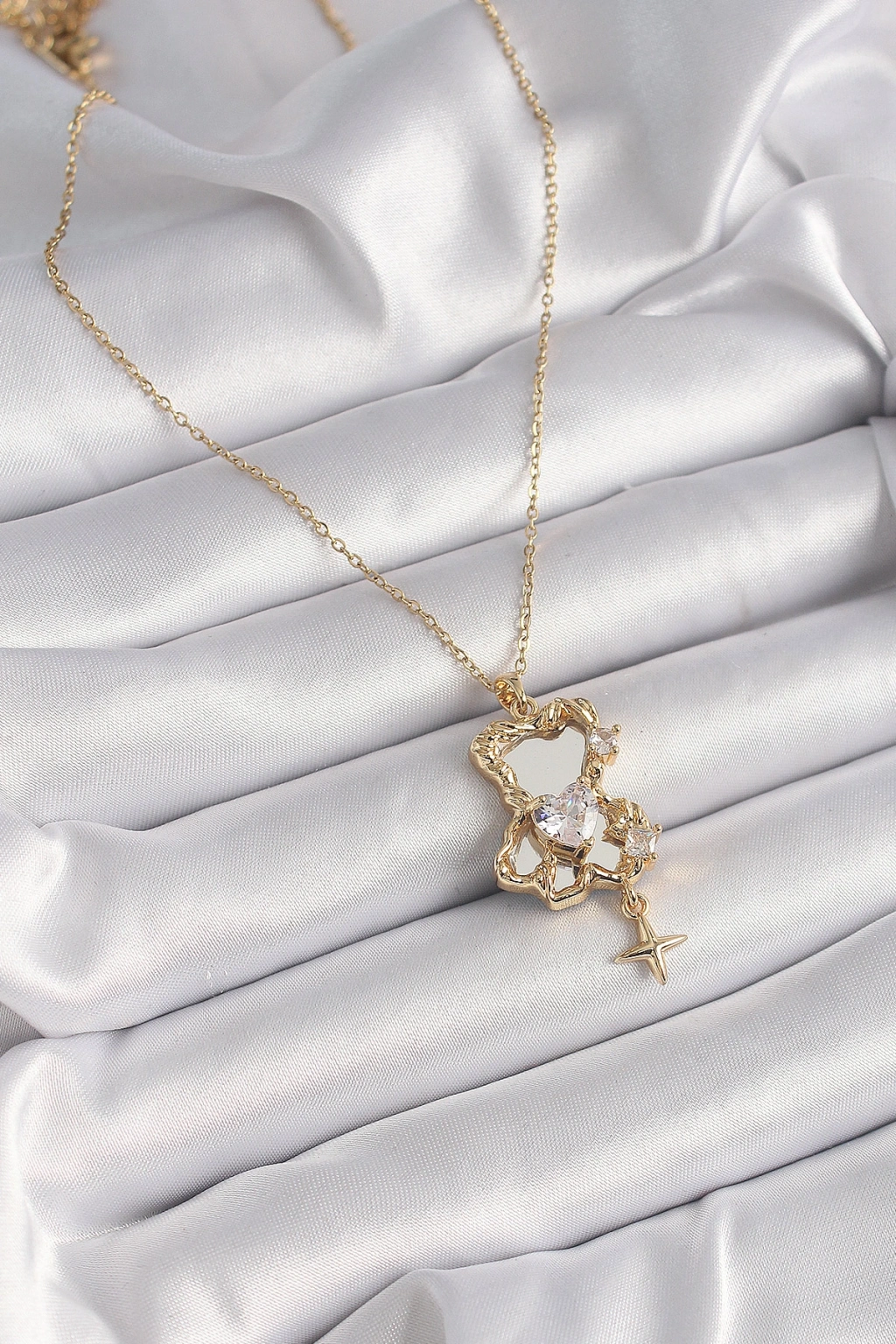 316L Çelik Gold Renk Zincir Ayna Ayıcık Model Zirkon Taşlı Kalp Model Kadın Kolye