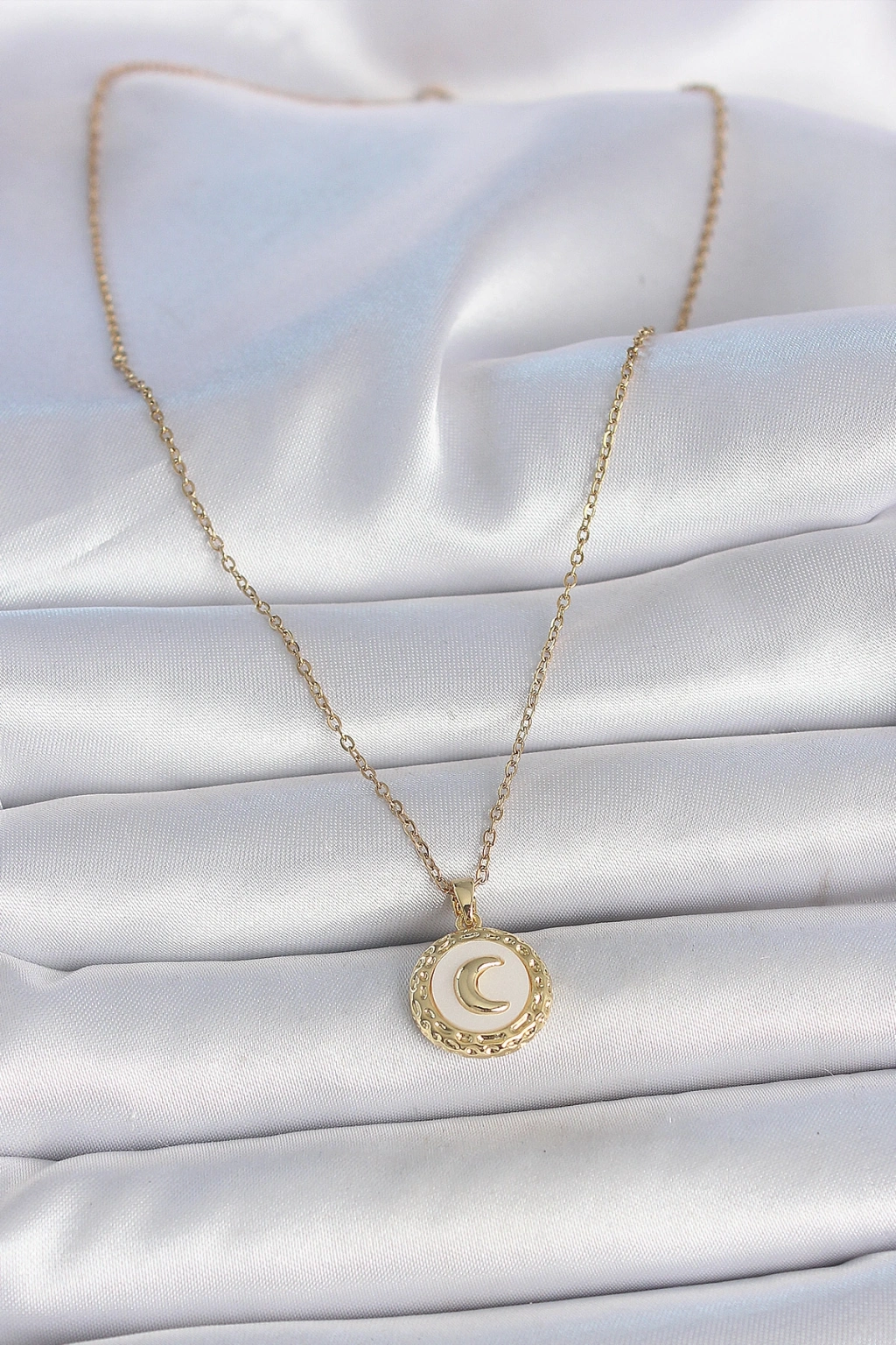 316L Çelik Gold Renk Zincir Beyaz Mineli Hilal İşlemeli Madalyon Model Kadın Kolye