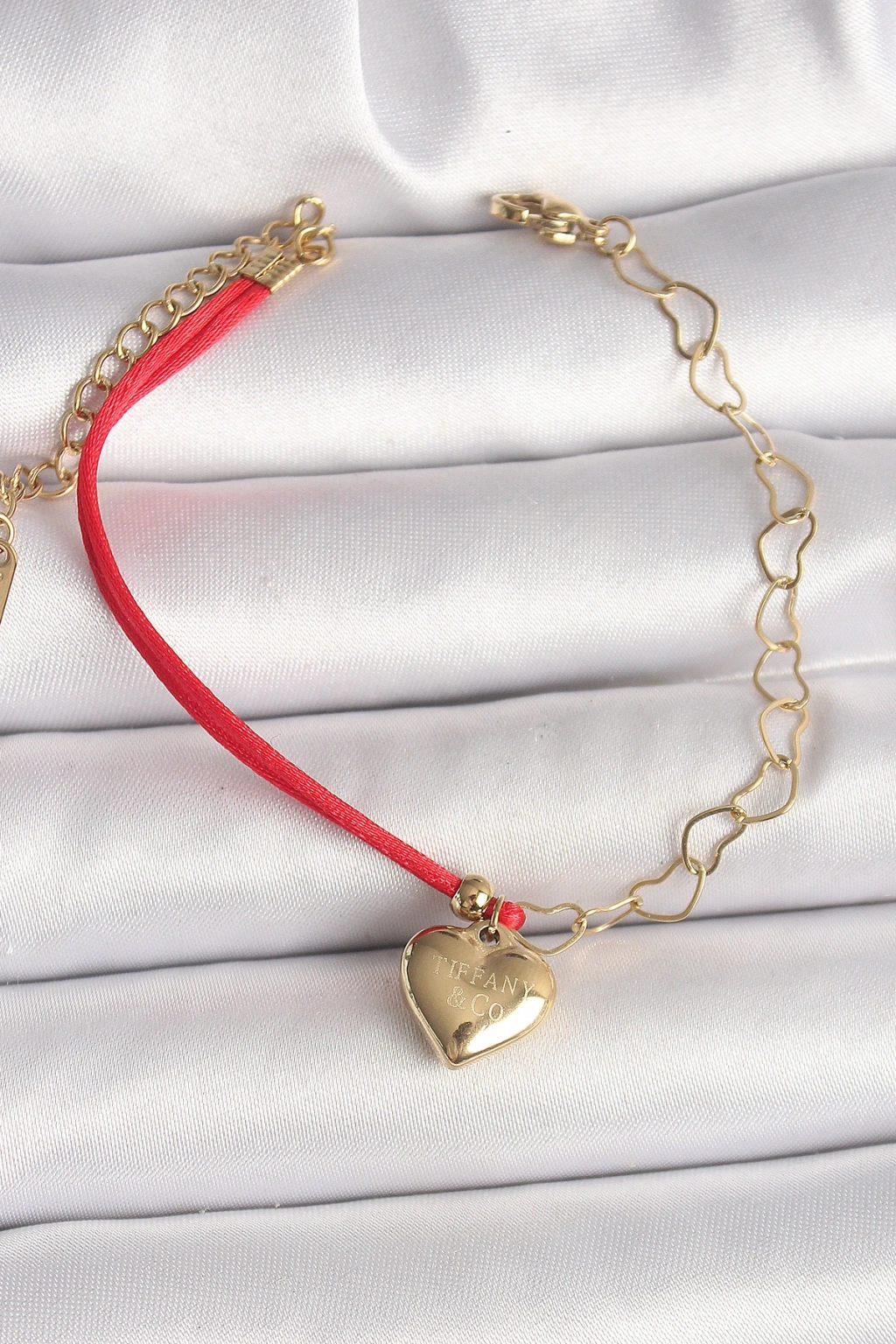 316l Çelik Gold Renk Zincir Kırmızı İp Model Sallantı Kalp Figür İşleme Detaylı Kadın Bileklik