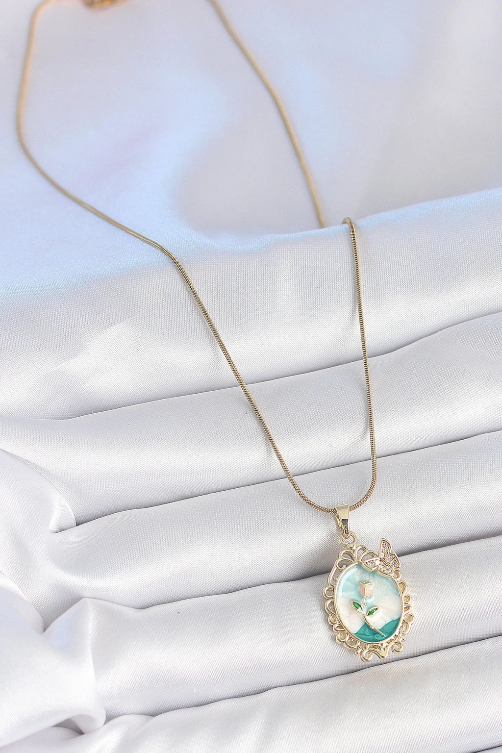 316l Çelik Gold Renk Zincir Mavi Mineli Çiçek İşlemeli Zirkon Taş Detaylı Portre Model Kadın Kolye