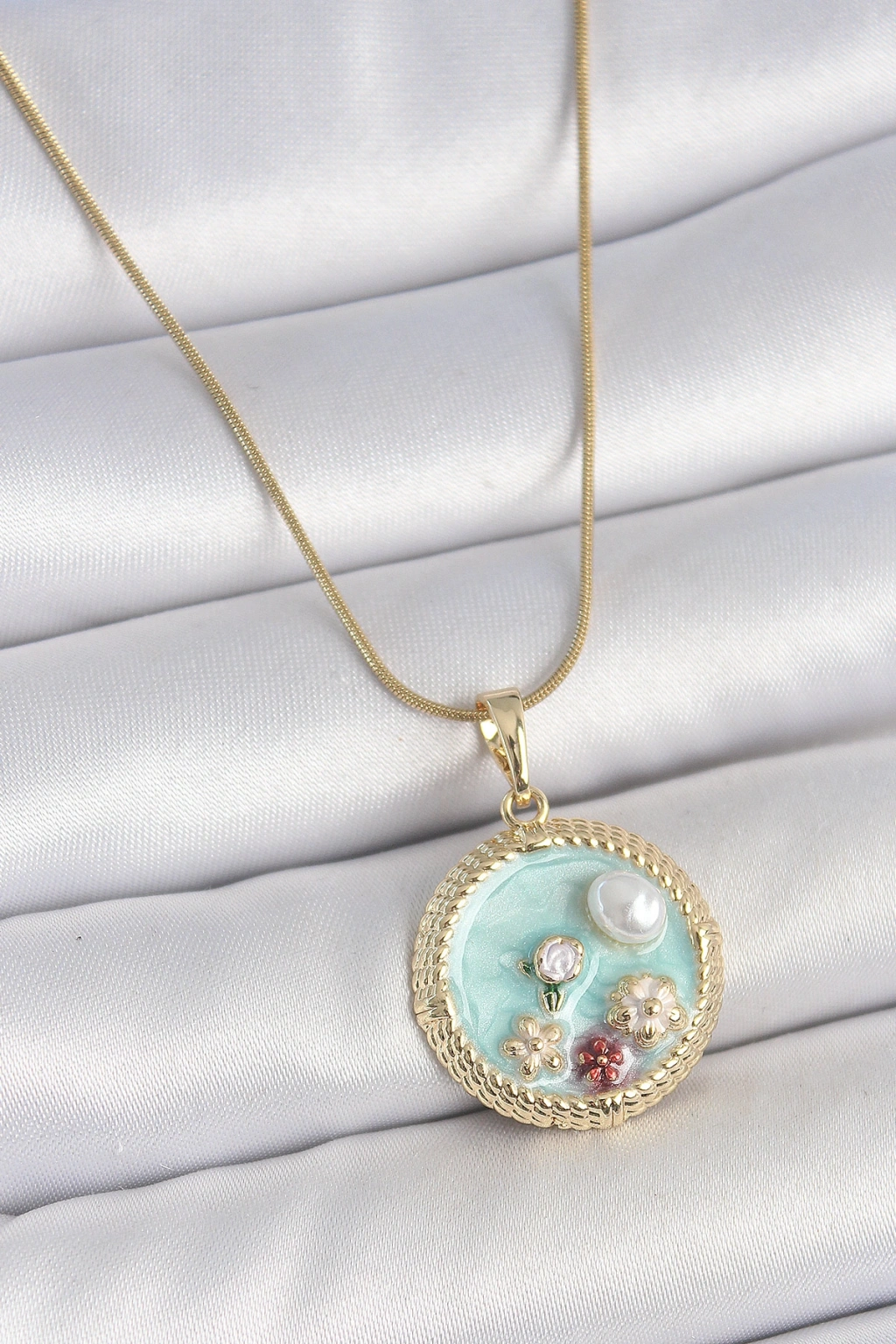 316L Çelik Gold Renk Zincir Mavi Mineli İnci Çiçek İşlemeli Zirkon Taş Detaylı Madalyon Model Kadın Kolye