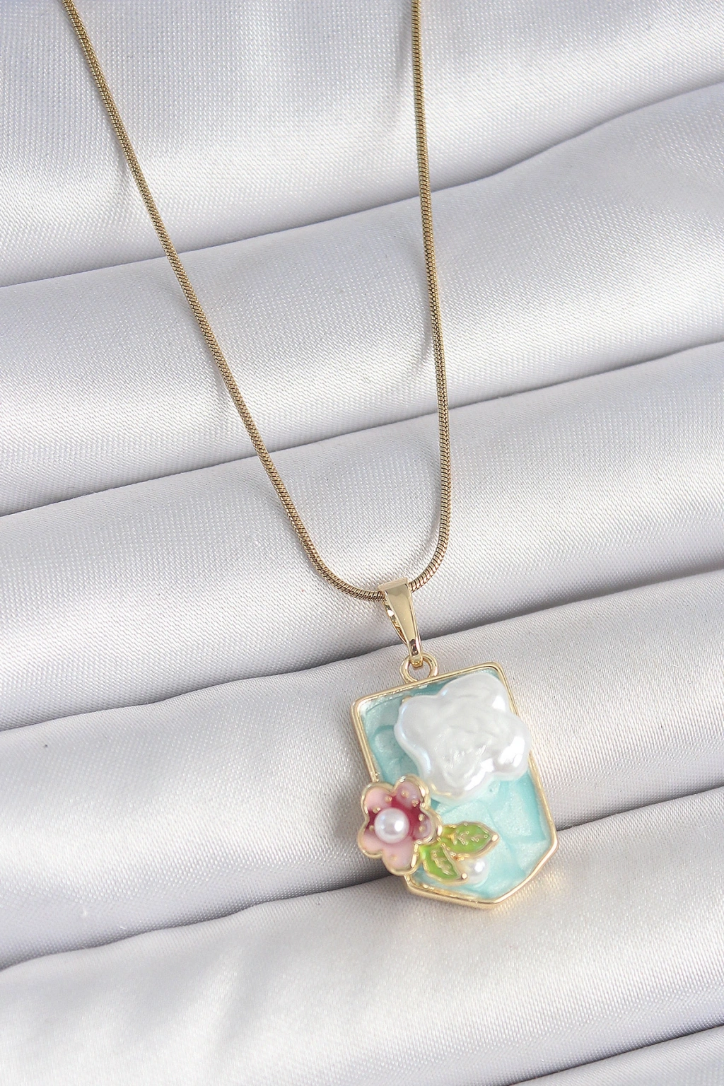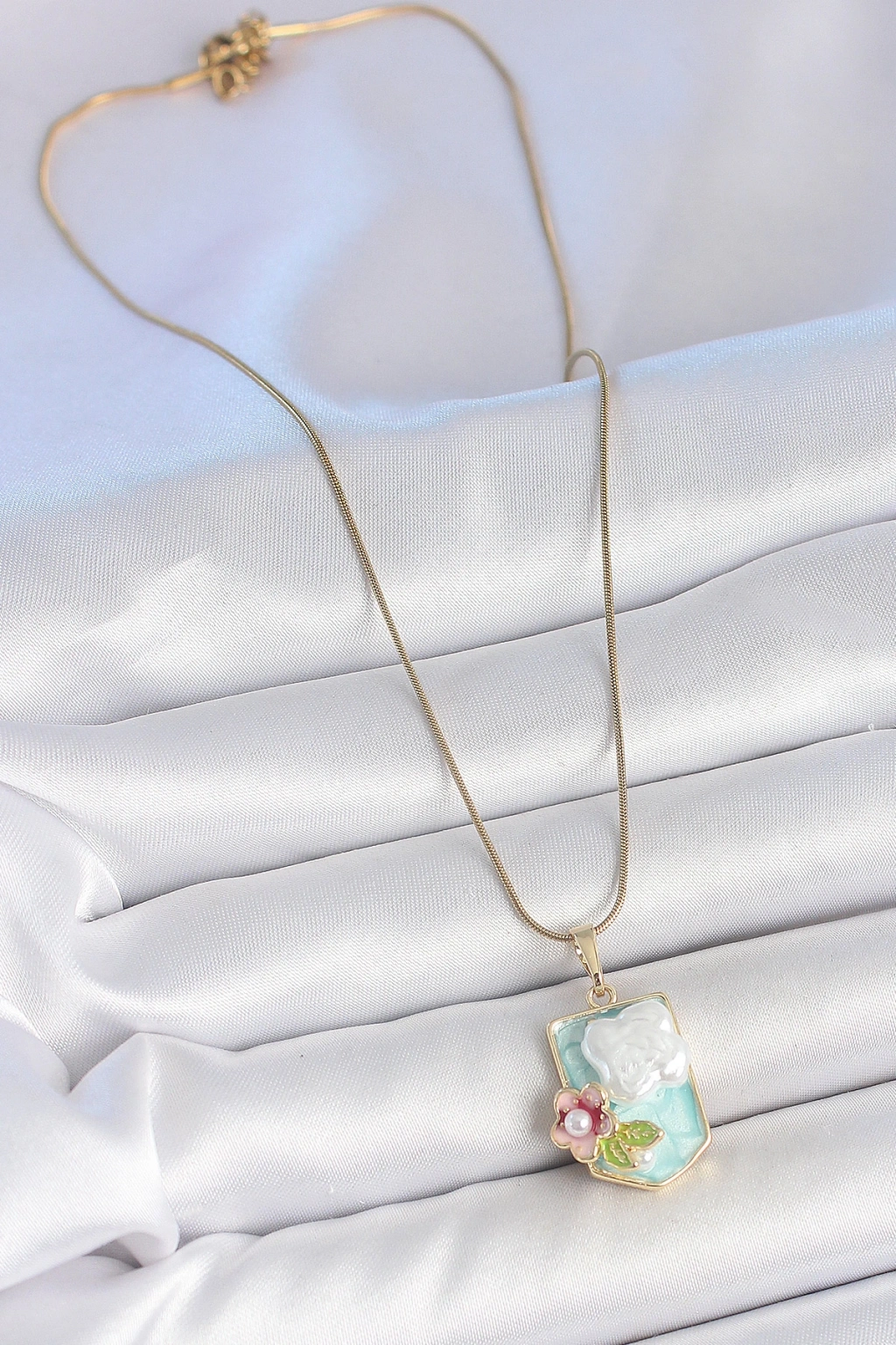 316l Çelik Gold Renk Zincir Mavi Mineli İncili Çiçek İşlemeli Portre Model Kadın Kolye