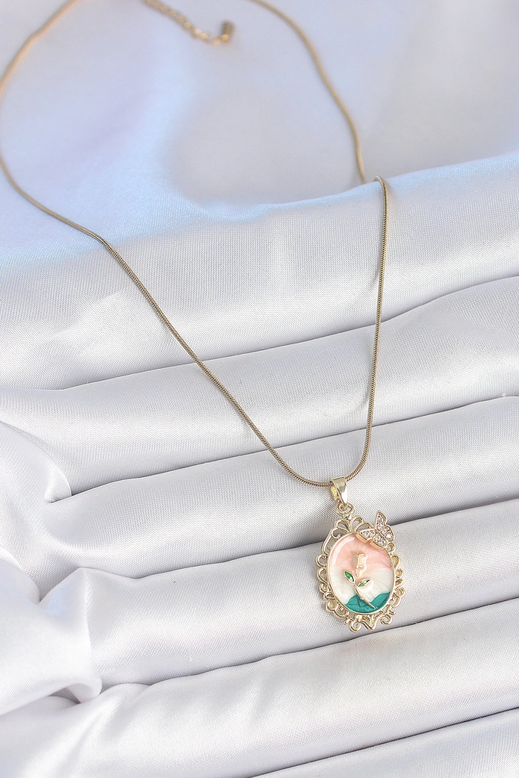 316l Çelik Gold Renk Zincir Mix Renk Çiçek İşlemeli Zirkon Taş Detaylı Portre Model Kadın Kolye