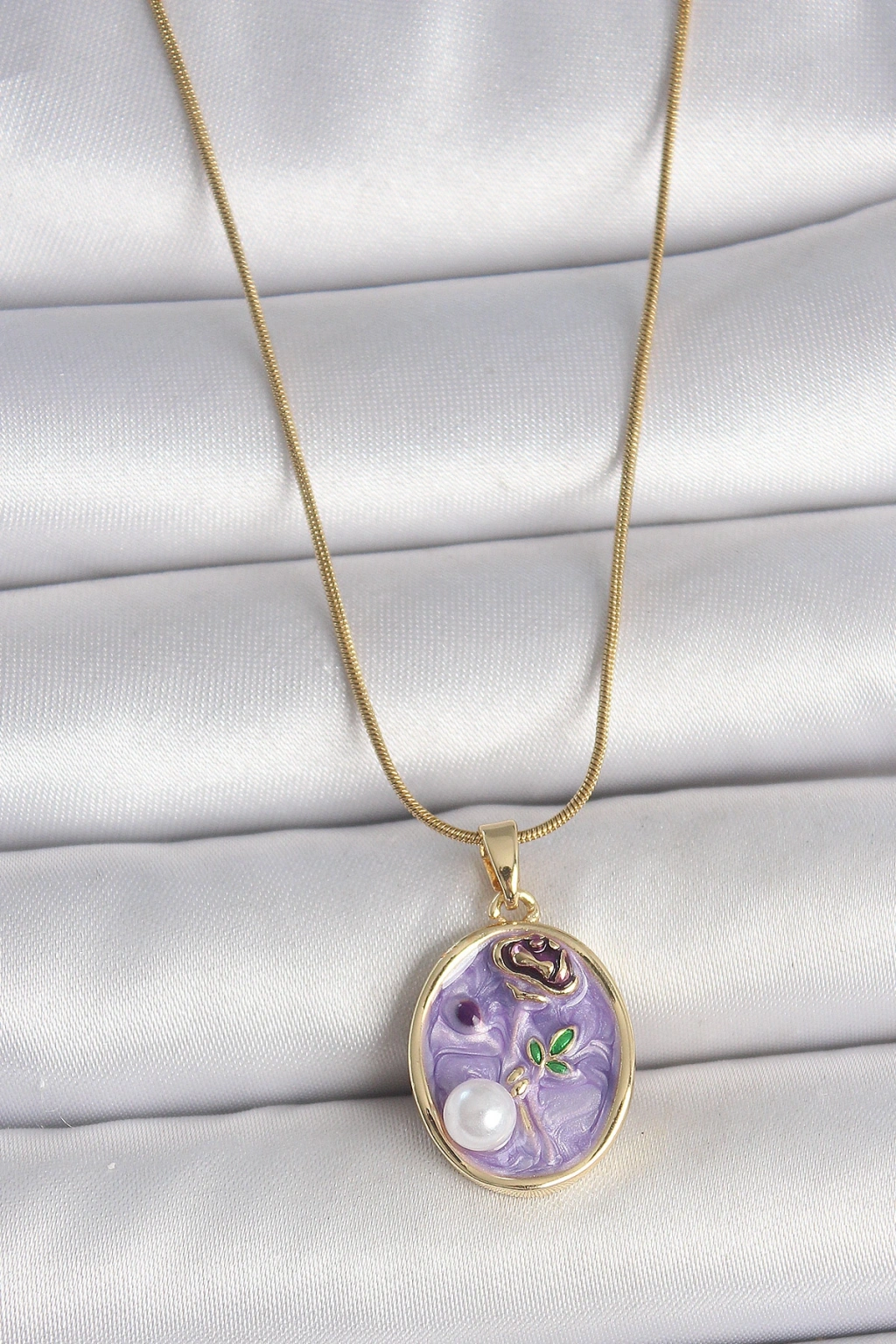 316l Çelik Gold Renk Zincir Mor Çiçek İşlemeli İnci Detay Portre Model Kadın Kolye