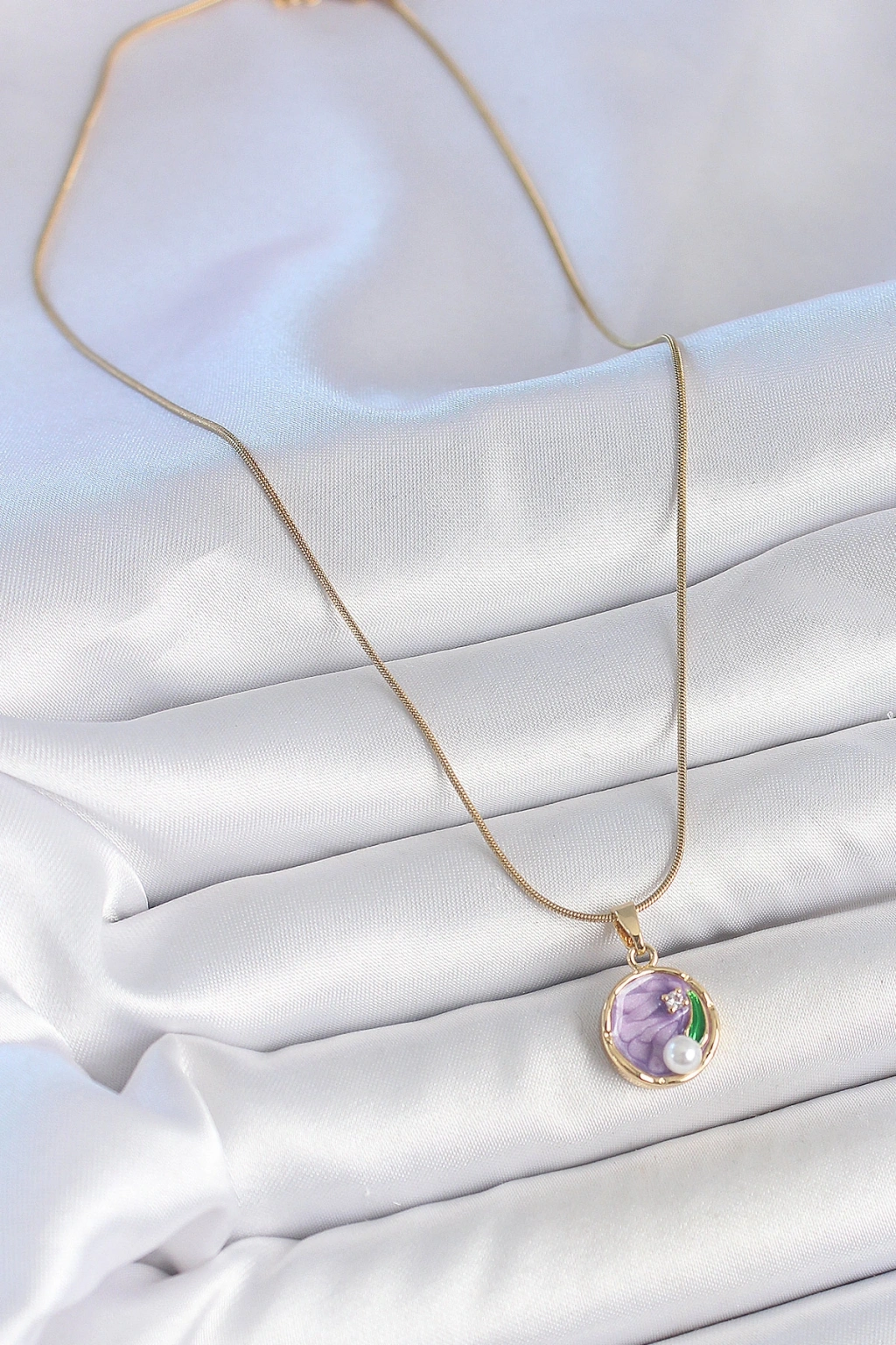 316l Çelik Gold Renk Zincir Mor Çiçek İşlemeli Zirkon Taş İnci Detaylı Minimal Portre Model Kadın Kolye