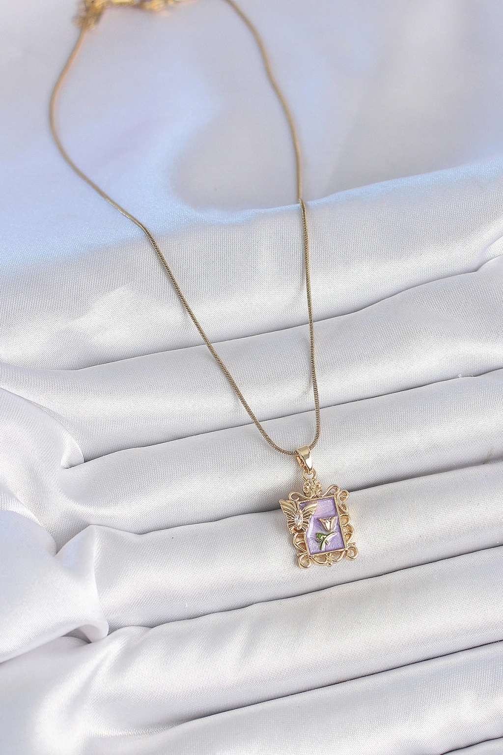 316l Çelik Gold Renk Zincir Mor Mineli Çiçek İşlemeli Zirkon Taşlı Kelebek Detay Portre Model Kadın Kolye