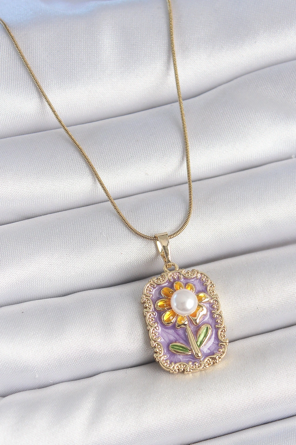 316l Çelik Gold Renk Zincir Mor Mineli İncili Papatya İşlemeli Portre Model Kadın Kolye
