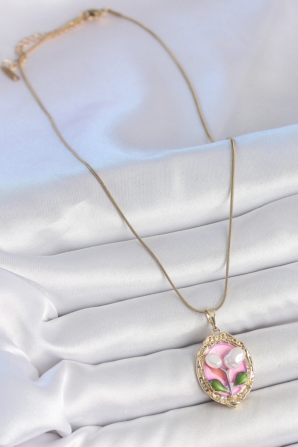316L Çelik Gold Renk Zincir Pembe Mineli İncili Çiçek İşlemeli Portre Model Kadın Kolye
