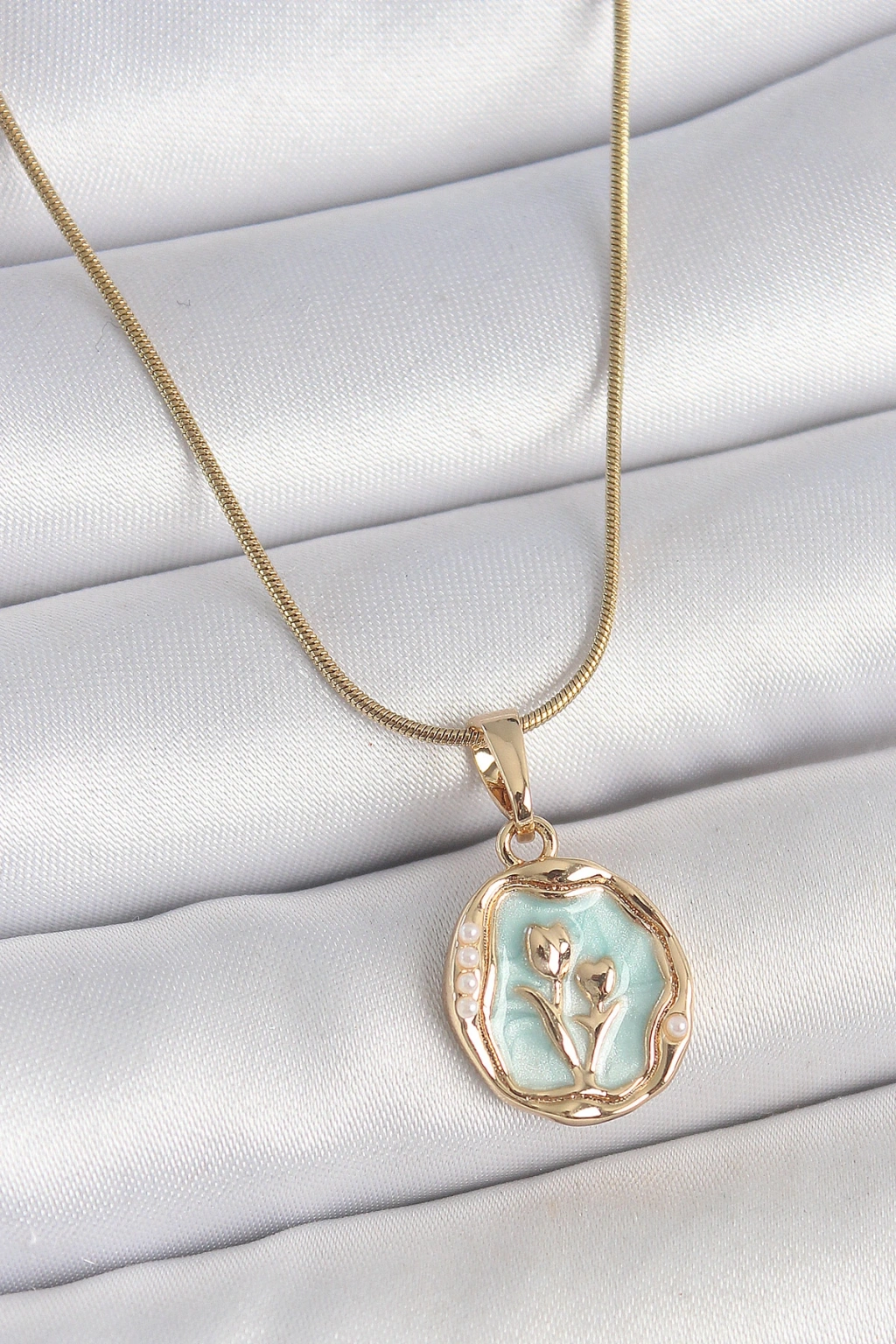 316l Çelik Gold Renk Zincir Turkuaz Mineli Çiçek İşlemeli Portre Model Kadın Kolye