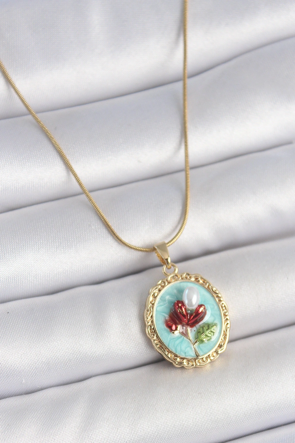 316l Çelik Gold Renk Zincir Turkuaz Mineli İncili Çiçek İşlemeli Portre Model Kadın Kolye