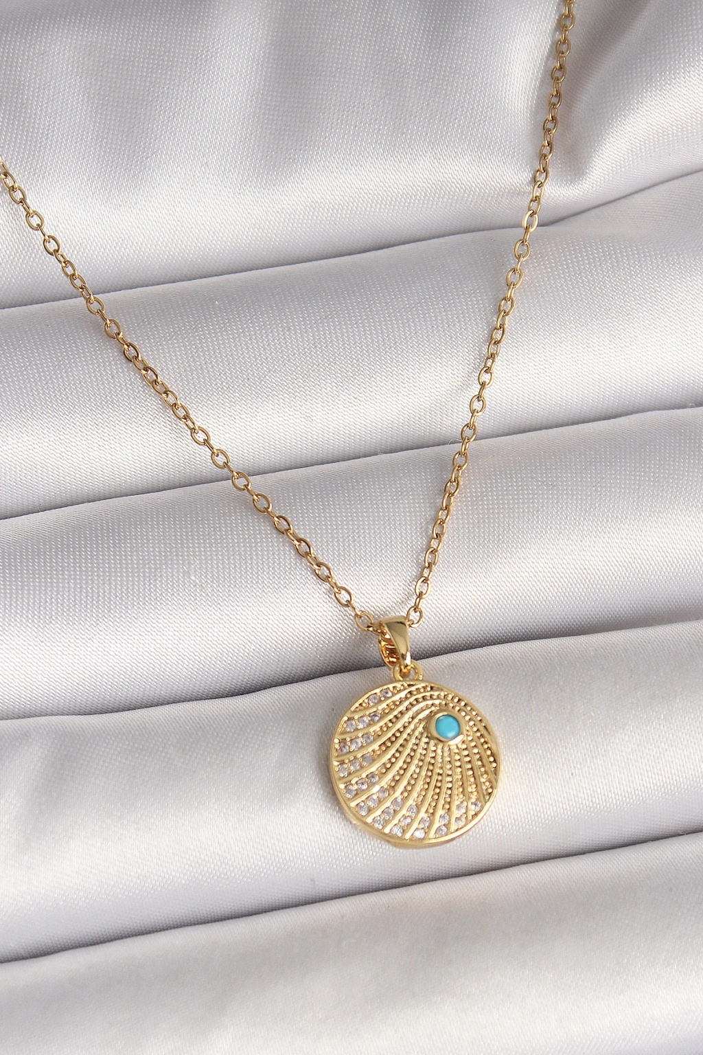 316l Çelik Gold Renk Zincir Zirkon Taş İşlemeli Mavi Taş Detaylı Madalyon Model Kadın Kolye