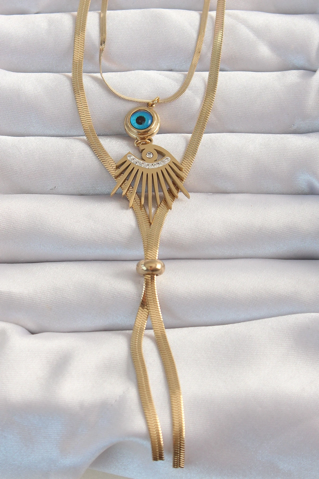 316l Çelik Gold Renk Zirkon Taşlı Göz Detay Nazarlı Uzun Asansör Model Kolye