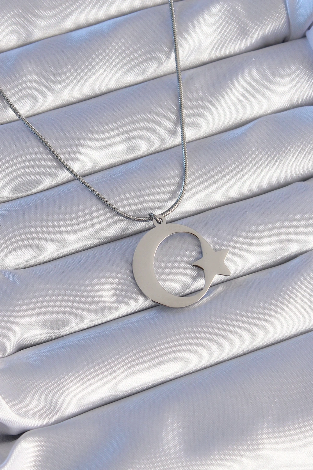 316l Çelik Gümüş Renk Ay Yıldız Model Unisex Kolye