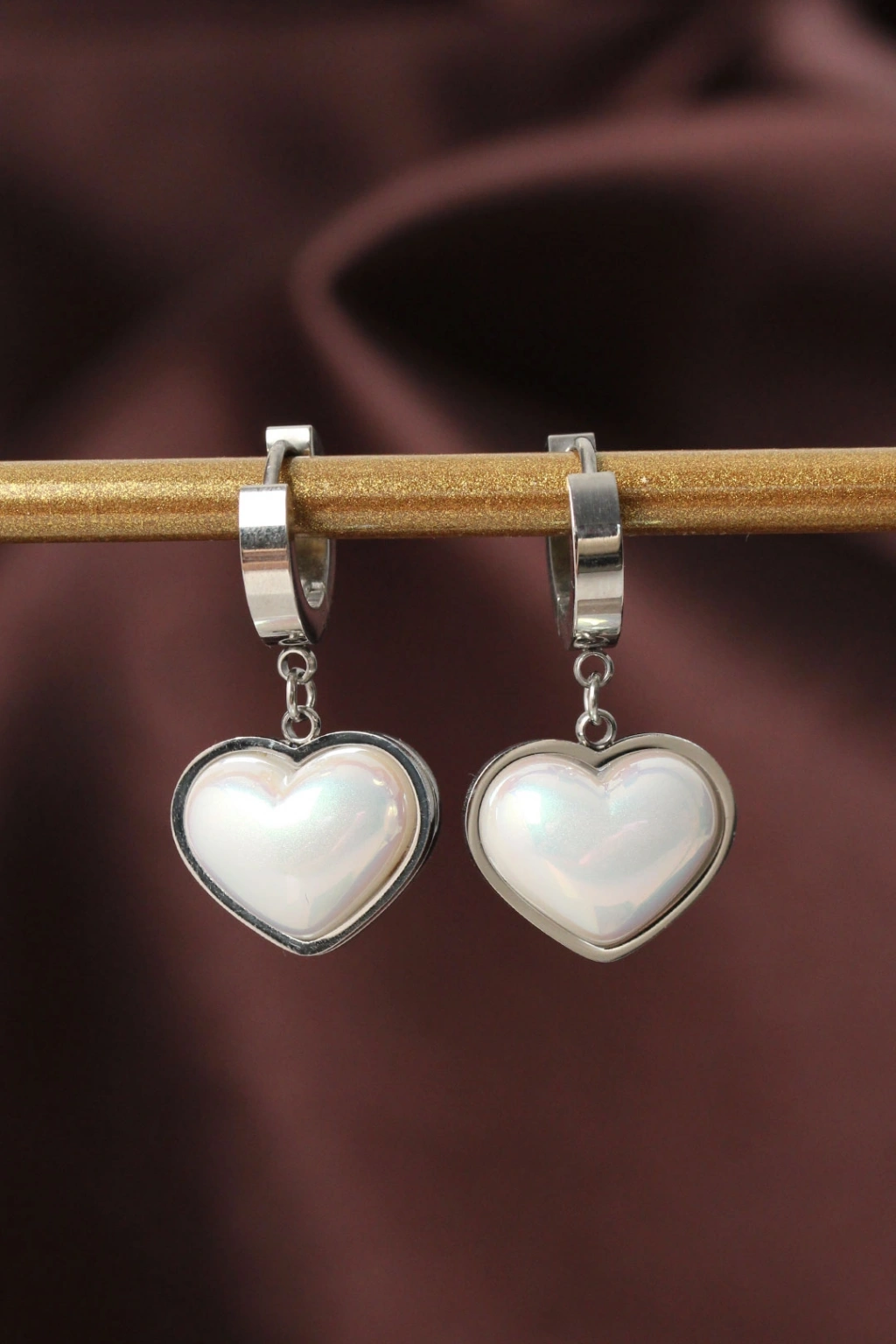 316L Çelik Gümüş Renk Beyaz Bombeli Kalp Küpe